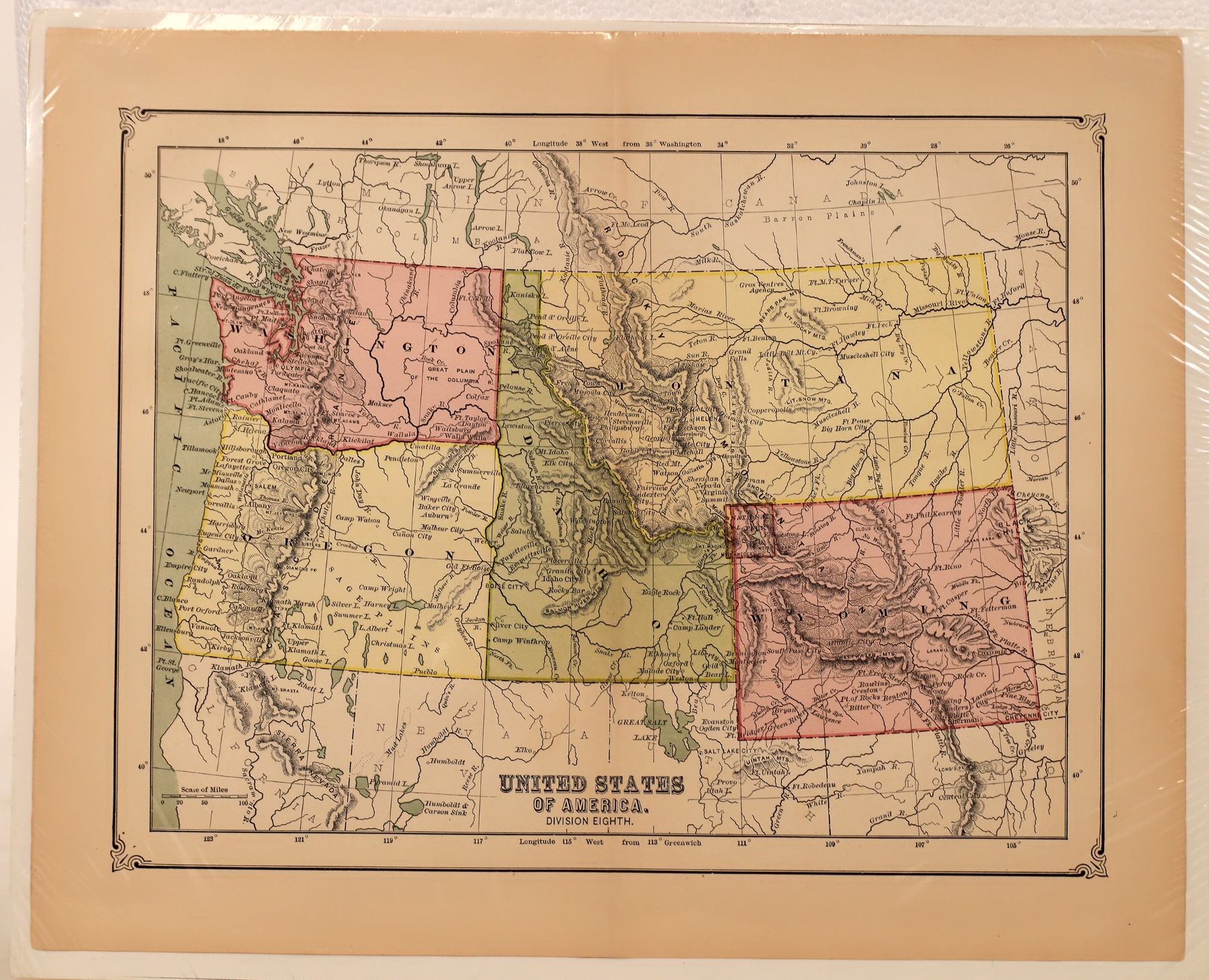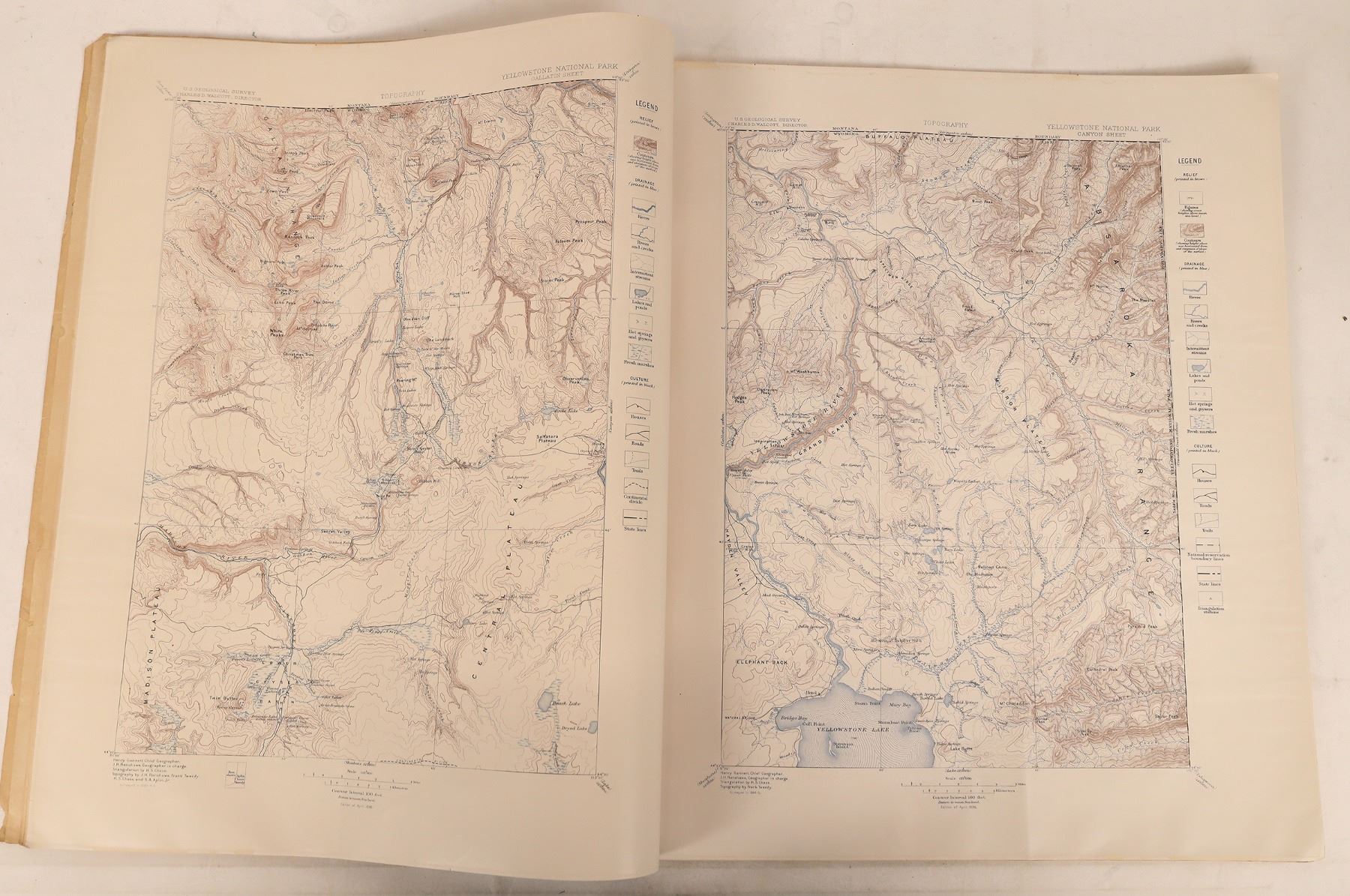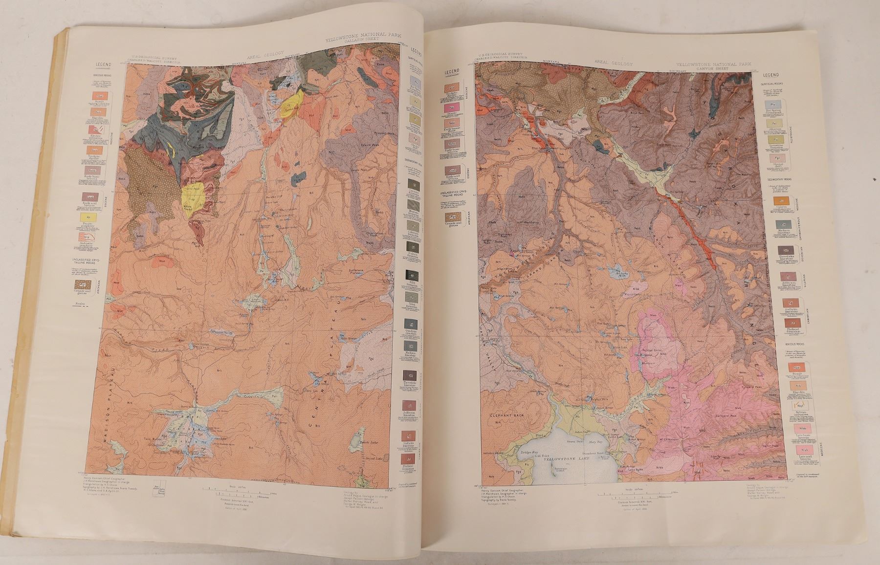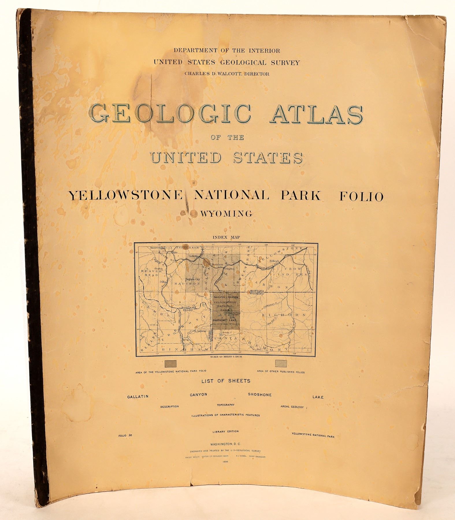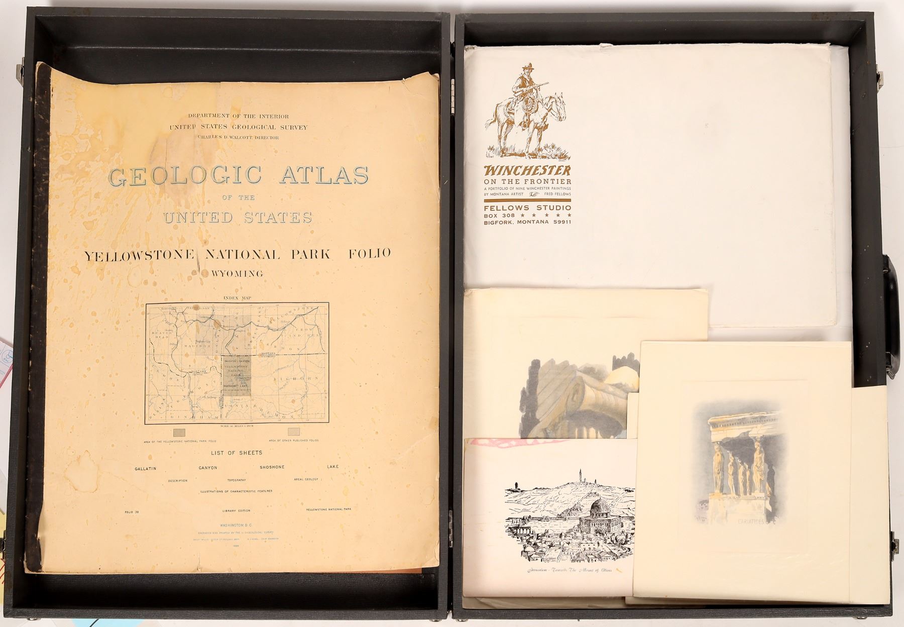 Issued by the Department of the Interior, under director Charles D. Walcott in 1896. 18 x 22 inch folio with several pages of description of the geology of the Yellowstone National Park, several pages of pictures, eight pages of colorful topographical maps. Also: 1858 "Map of the Territory of the United States from the Mississippi to the Pacific Ocean" (partial) by Gouverneur Kemble Warren, in colors, 20 x 14 inches. c1868. Another map, Dakota to Wiscnsin, 1879 "Gotha: Justus Perthes", 1:370,000; Five pieces of miscellaneous artwork: sketches of Roman ruins and cherubs. Undated color map of the Pacific Northwest, 12 x 10 inches. "Winchester on the Frontier" a portfolio of nine winchester paingtings by Montana artist Fred Fellows, in original folder with personal letter from 1970 from Fellows to a Pote Morrow. Prints are 15 x 11 inches. Wyoming 1896