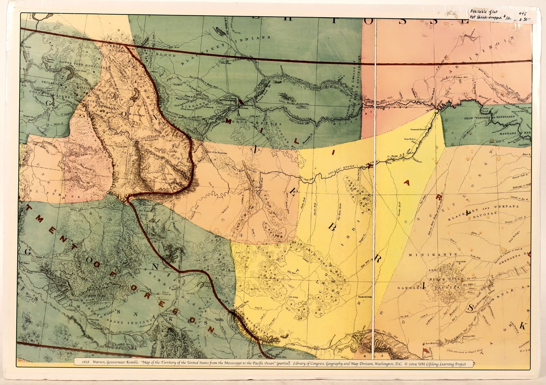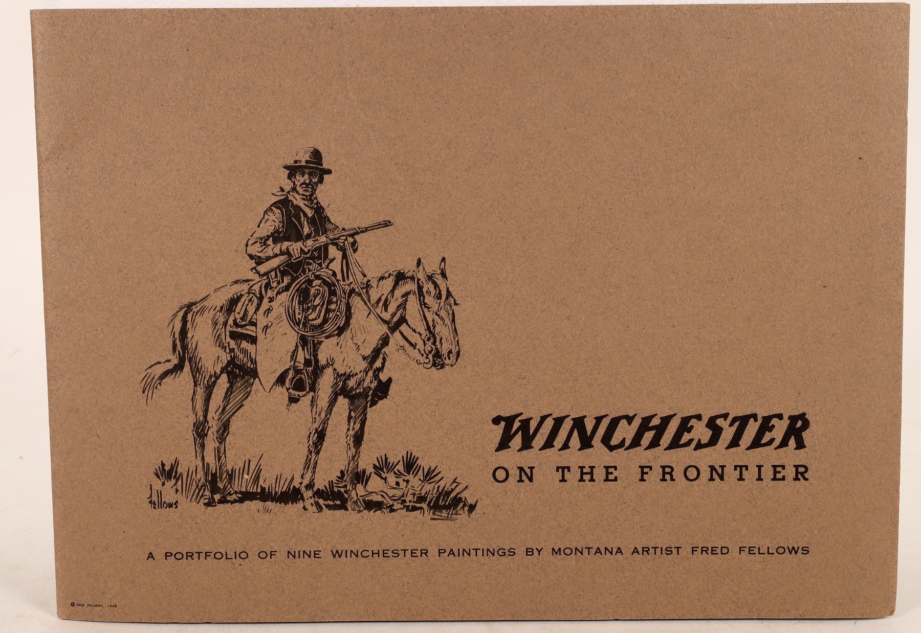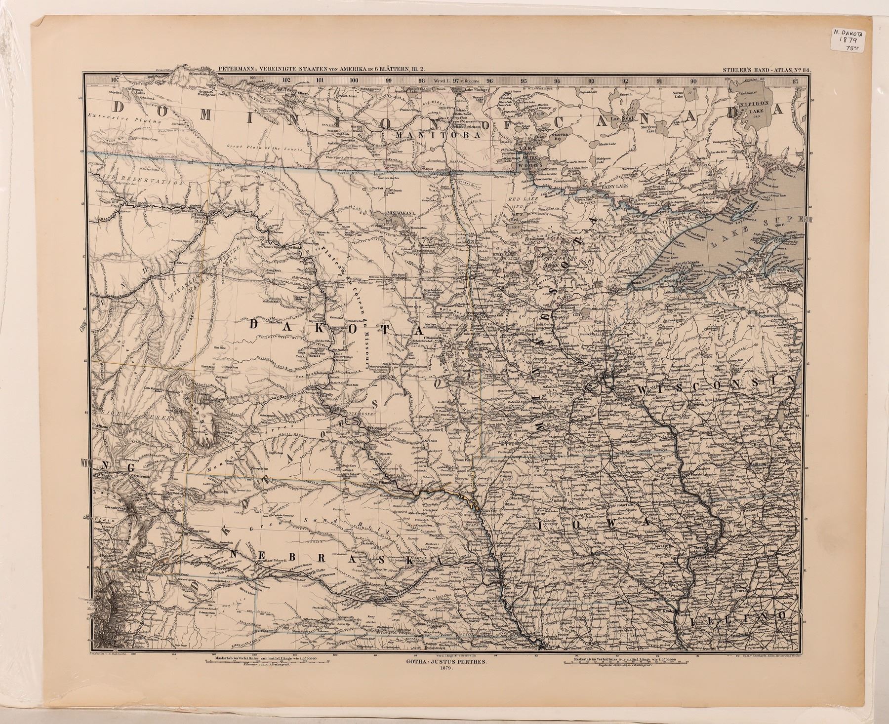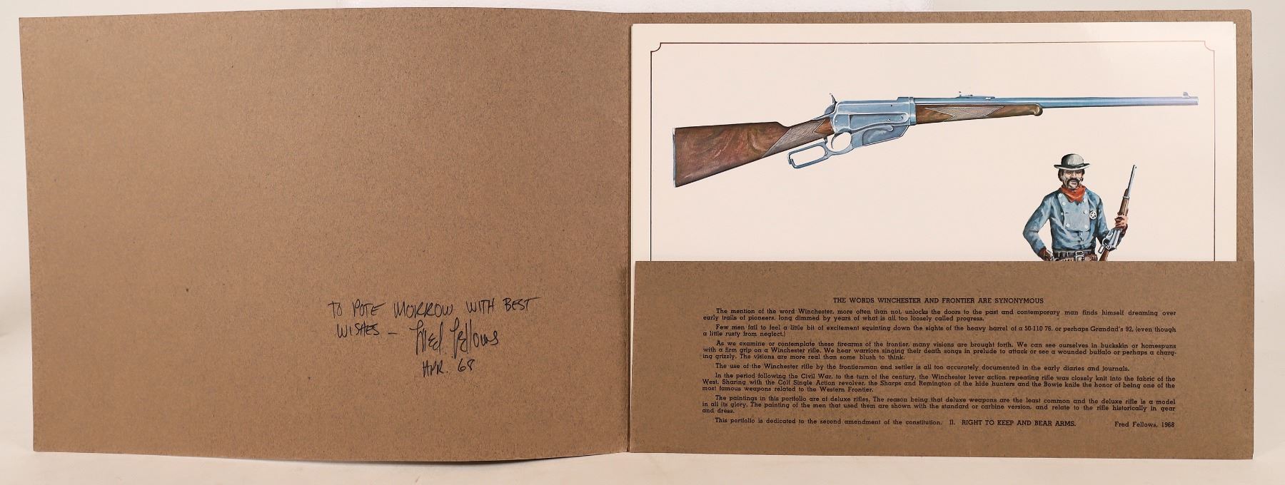 Issued by the Department of the Interior, under director Charles D. Walcott in 1896. 18 x 22 inch folio with several pages of description of the geology of the Yellowstone National Park, several pages of pictures, eight pages of colorful topographical maps. Also: 1858 "Map of the Territory of the United States from the Mississippi to the Pacific Ocean" (partial) by Gouverneur Kemble Warren, in colors, 20 x 14 inches. c1868. Another map, Dakota to Wiscnsin, 1879 "Gotha: Justus Perthes", 1:370,000; Five pieces of miscellaneous artwork: sketches of Roman ruins and cherubs. Undated color map of the Pacific Northwest, 12 x 10 inches. "Winchester on the Frontier" a portfolio of nine winchester paingtings by Montana artist Fred Fellows, in original folder with personal letter from 1970 from Fellows to a Pote Morrow. Prints are 15 x 11 inches. Wyoming 1896