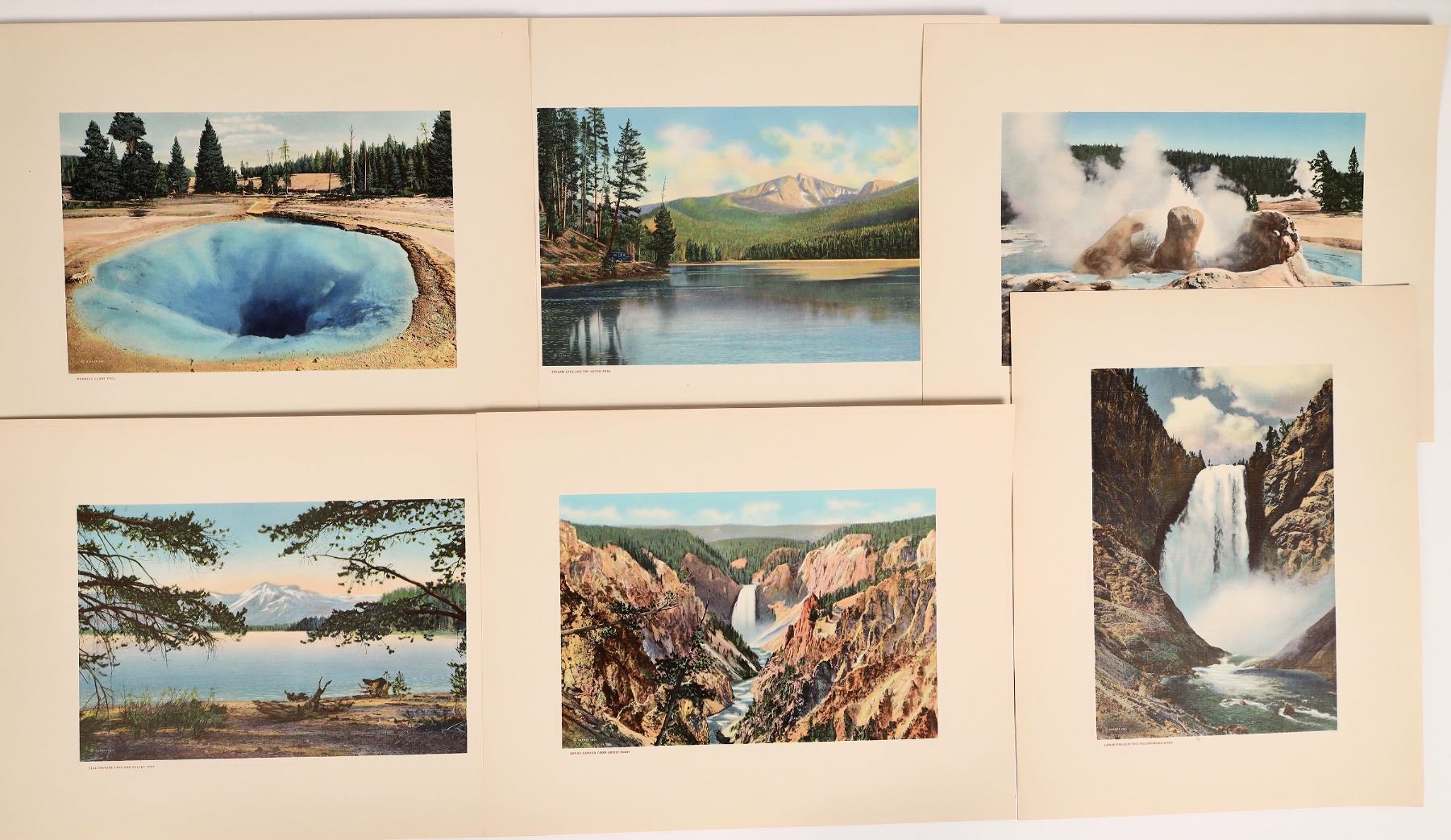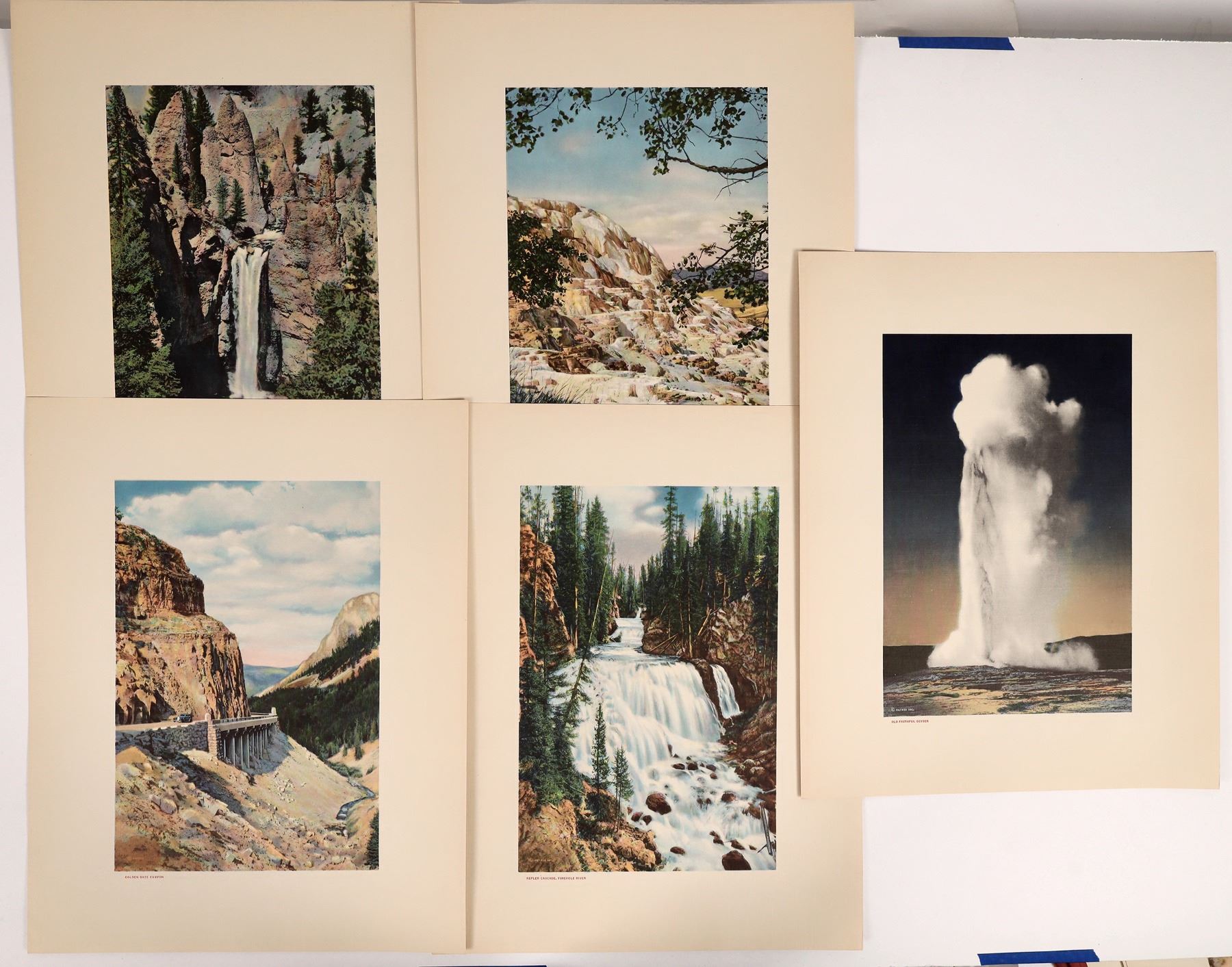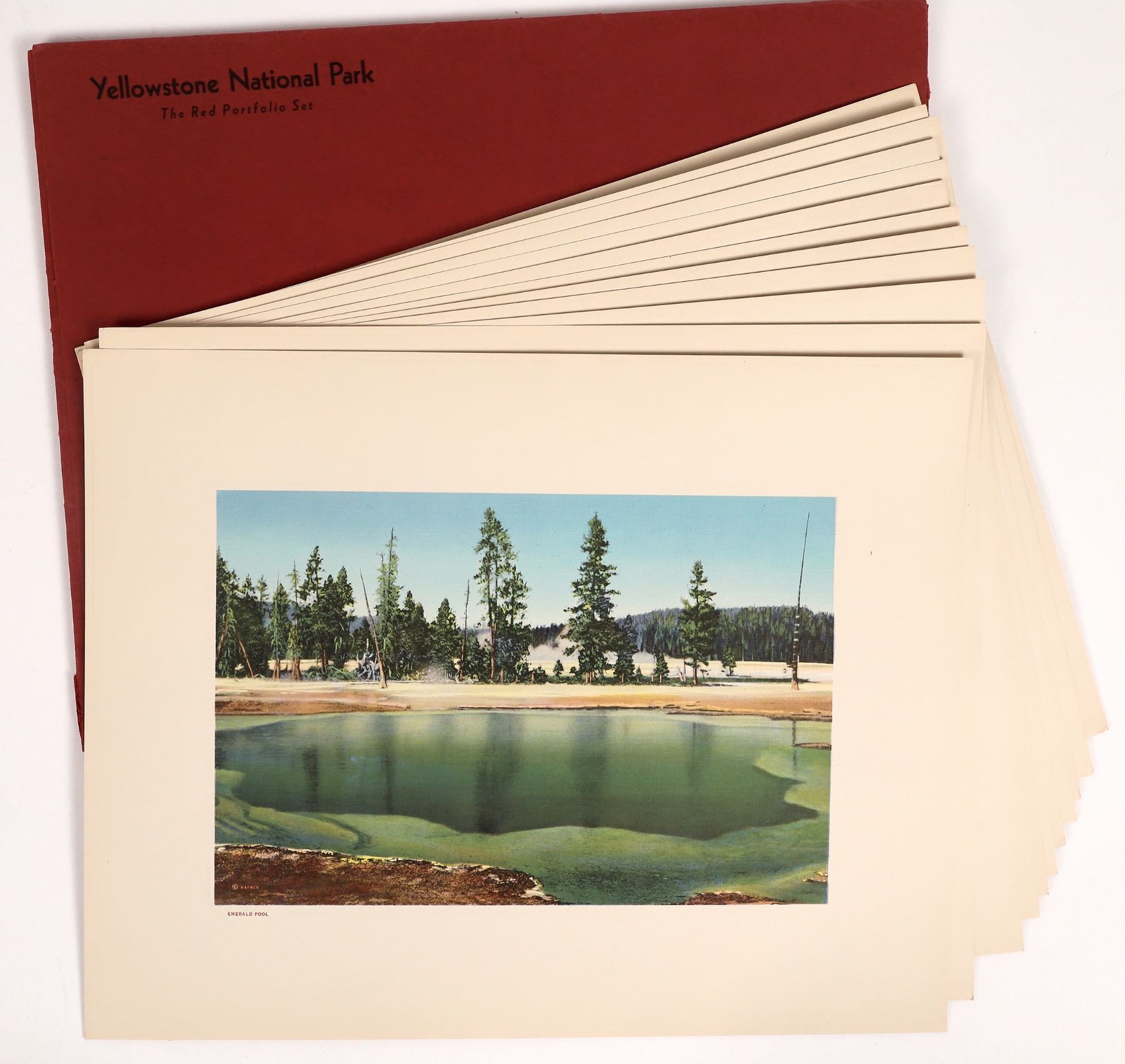 "The Red Portfolio Set." Haynes Inc., Yellowstone Park, Wyoming. Includes twelve different colored photographs printed on linen paper. Each is 12.5 x 10" Views include: Lower Falls of the Yellowstone River, Jupiter Terrace, Old Faithful, Golden Gate Canyon, Kepler Cascade, Yellowstone Lake, Grotto Geyser, Emerald Pool, and more. Each is suitable for framing. Come in red folder and original red envelope. No date, but c.1930s. Tears to mailing envelope.