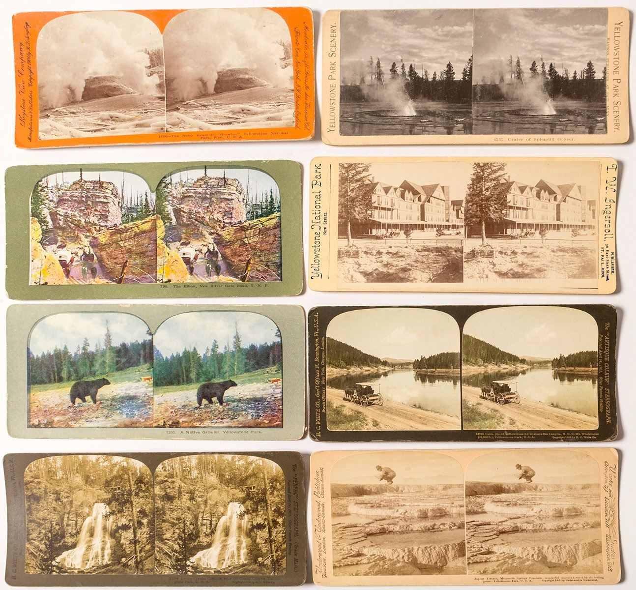 Lot of 8 different. Includes: 13595--The Noisy Roadside "Growler" (Keystone); 4535--Crater of the Splendid Geyser (Haynes); Jupiter Terrace, Mammoth Springs Formation (Underwood & Underwood); wagon above Yellowstone River (HC White & Co.); M.H.S. Hotel (Ingersoll); 12094--Crystal Cascade (H.C. White & Co.); and two color cards without publishers showing a bear and The Elbow. (Prag Collection) Date: Location: Yellowstone , Wyoming HWAC# 50694