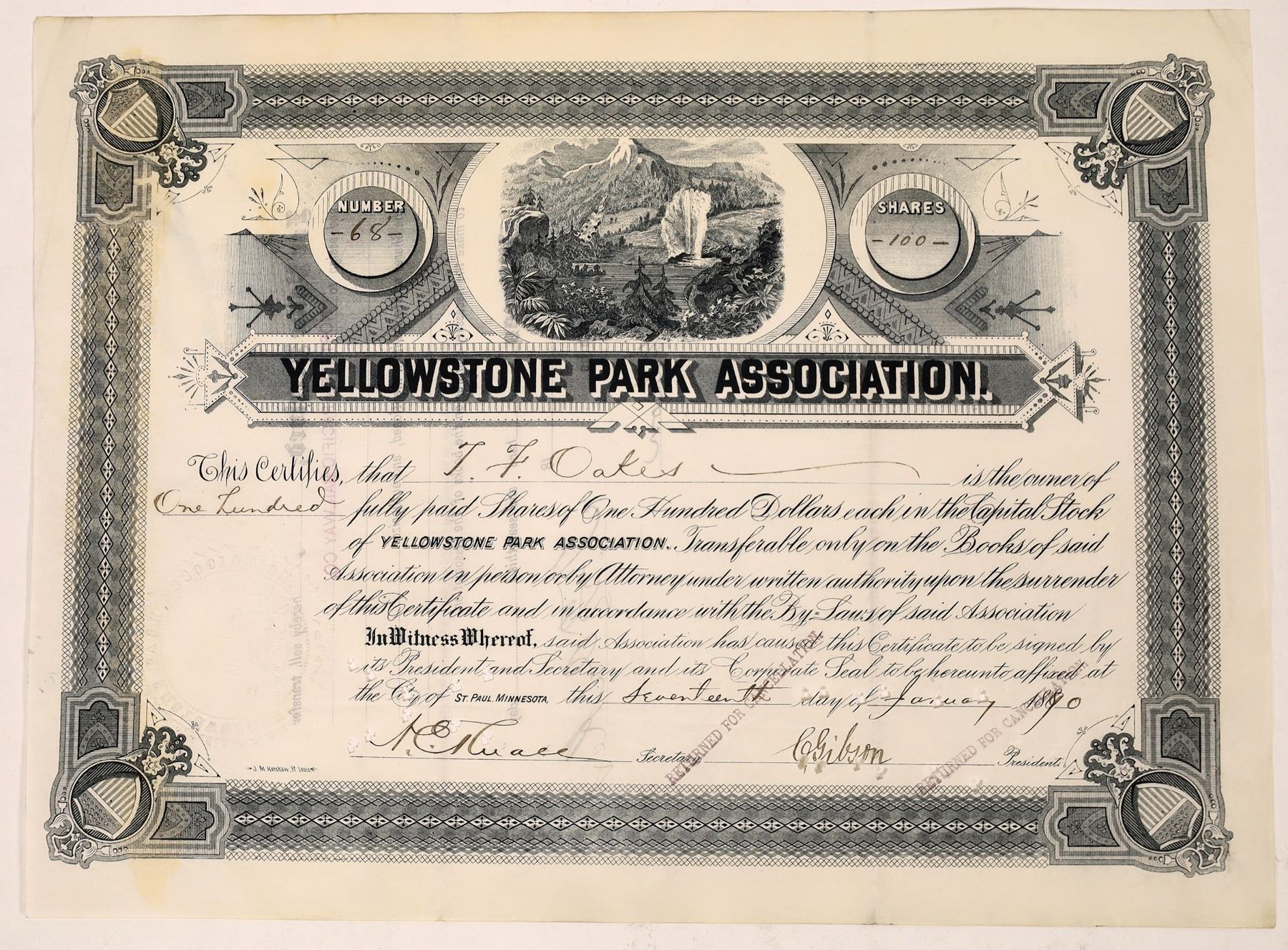Number 68 for 100 shares to TF Oakes. Signed by C Gibson and secretary Chase. Hole punch cancelled. Old faithful vignette. Nice condition. early. Gibson was president of the Association at this time. Seal had a stag vignette in center. Datelined St. Paul. Stuart Mackenzie Montana Collection