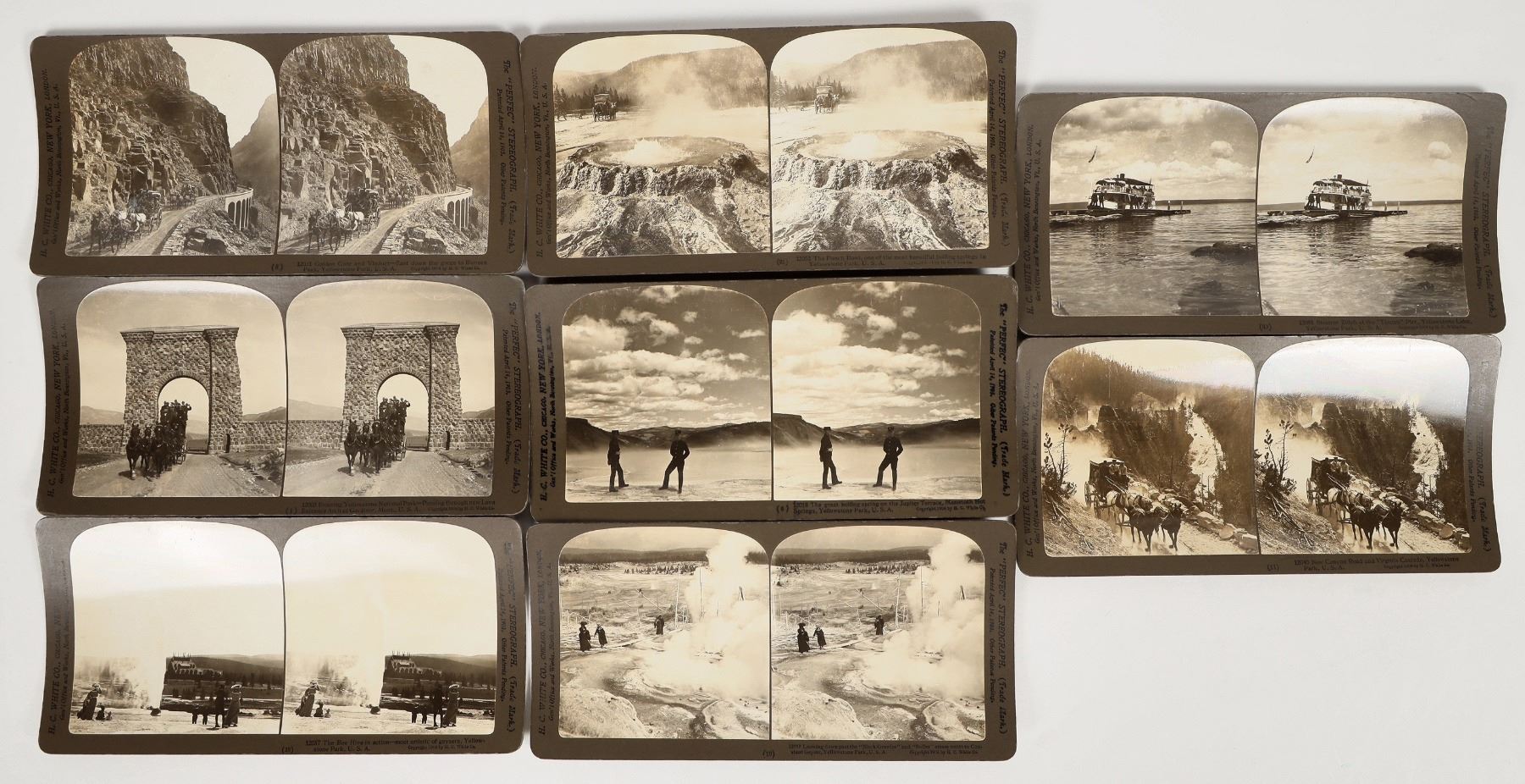 Lot of 8 different stereoviews by HC White Company, 1904. Includes: stage on New Canyon Road, Steamer Zillah on Yellowstone Lake, geysers such as Jupiter Terrace, Punch Bowl, Bee Hive, stagecoach coming into Lava Entrance Arch, and stage at Golden Gate. Nice contrast and details!