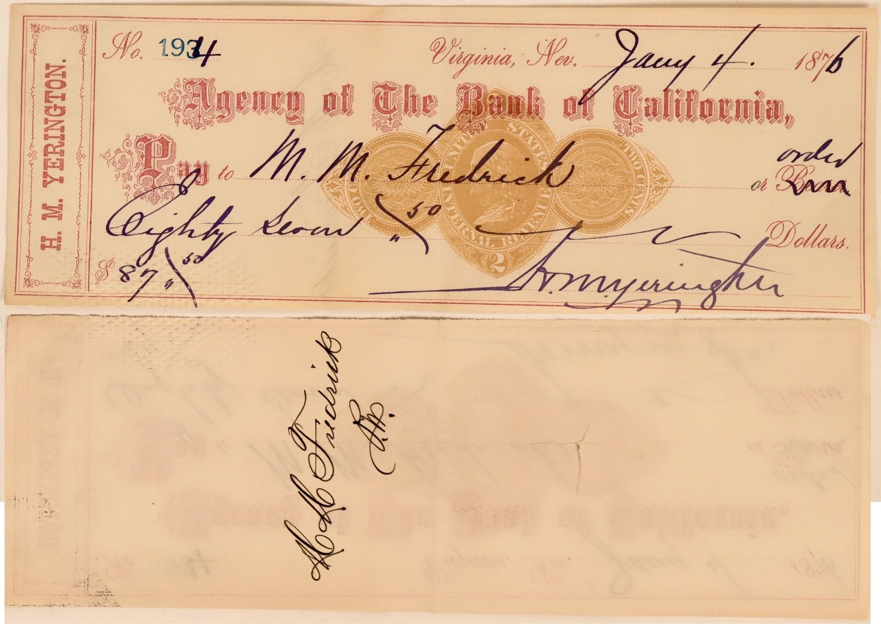 Bank of California, HM Yerington, Virginia, Nev., January 4, 1876. Issued to MM Fredrick for $87.50. Signed by HM Yerington. Endorsed on the back for Fredrick. Spindle cancel. Fredrick was a prominent jeweler and silver dealer in Virginia City.