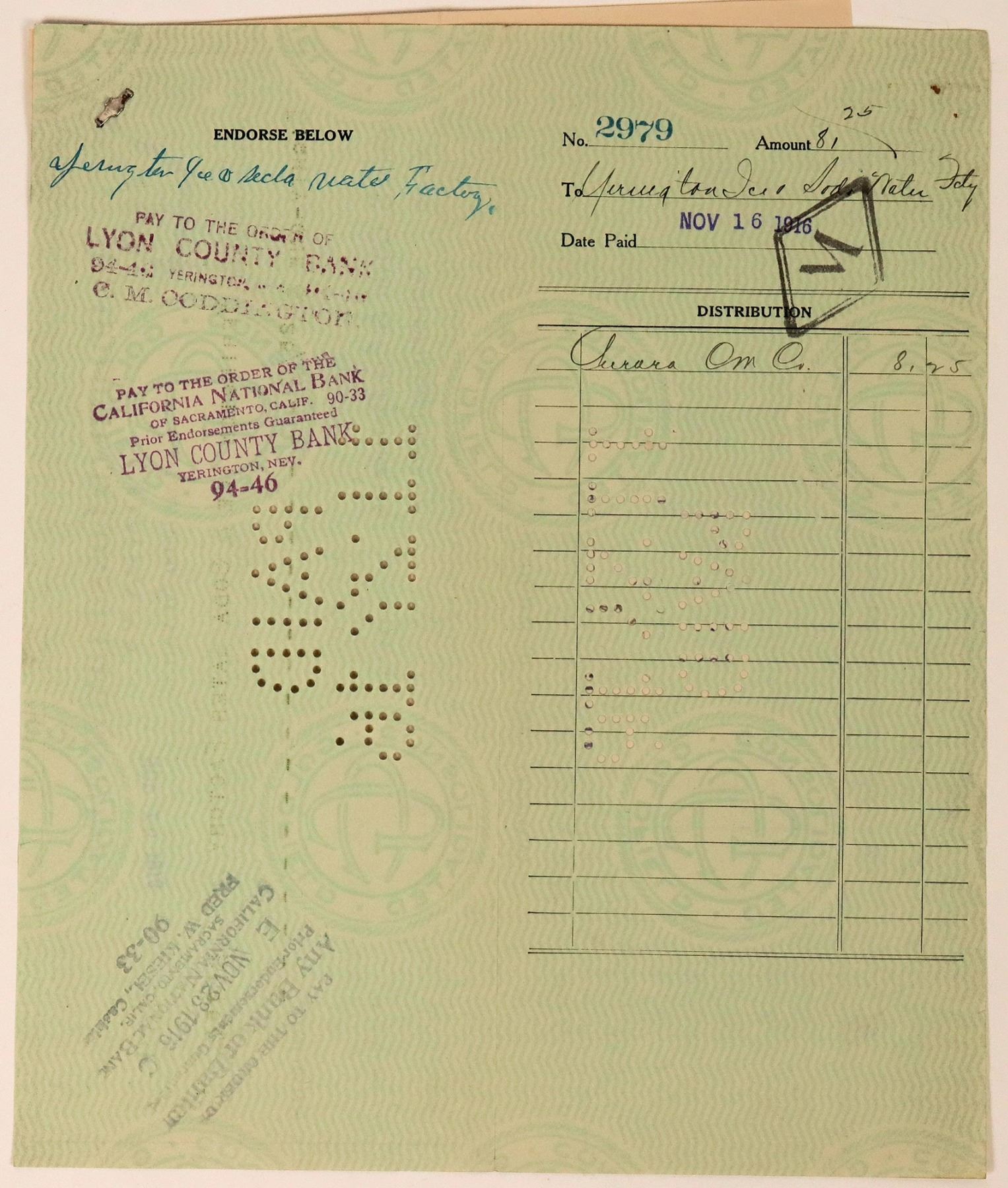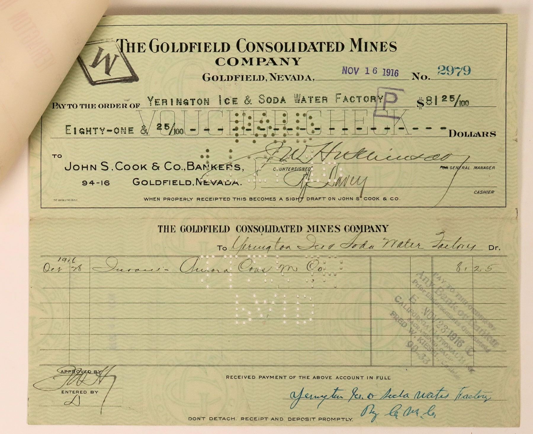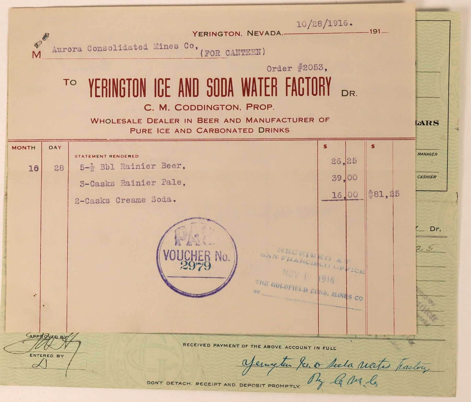 Unique. Billhead dated 1916 to the Aurora Consolidated Mines Co. for Rainier beer and cream soda. Red print. Attached to check from the Goldfield Consolidated Mines Company, punch cancelled. The Yerington Ice & Soda Water Factory was owned by CM Coddington. He had bought John Finning's soda water and ice business in 1911. Coddington sold beer, ice, and carbonated beverages. Business likely operated until the 1920s. Known to bottle collectors for an embossed clear crown top four-piece mold bottle. For more historical info, please see Volume One of the Nevada Bottle Book.