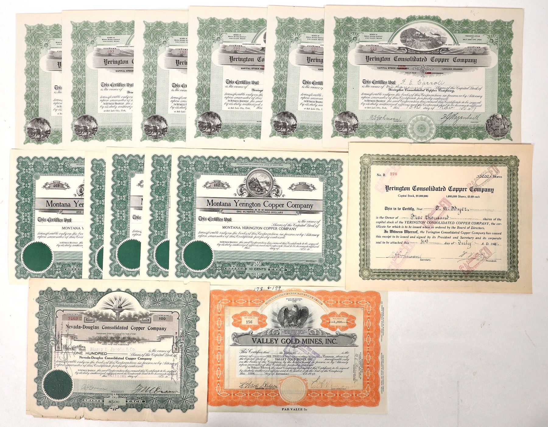 Unissued-5x Montana Yerington Copper, 6x Yerington Cons. Copper. Issued-1937 Valley Gold Mines, 1918 Nevada=Douglas Cons Copper-edge issues, 1911 and 1917 Yerington Cons. Copper.