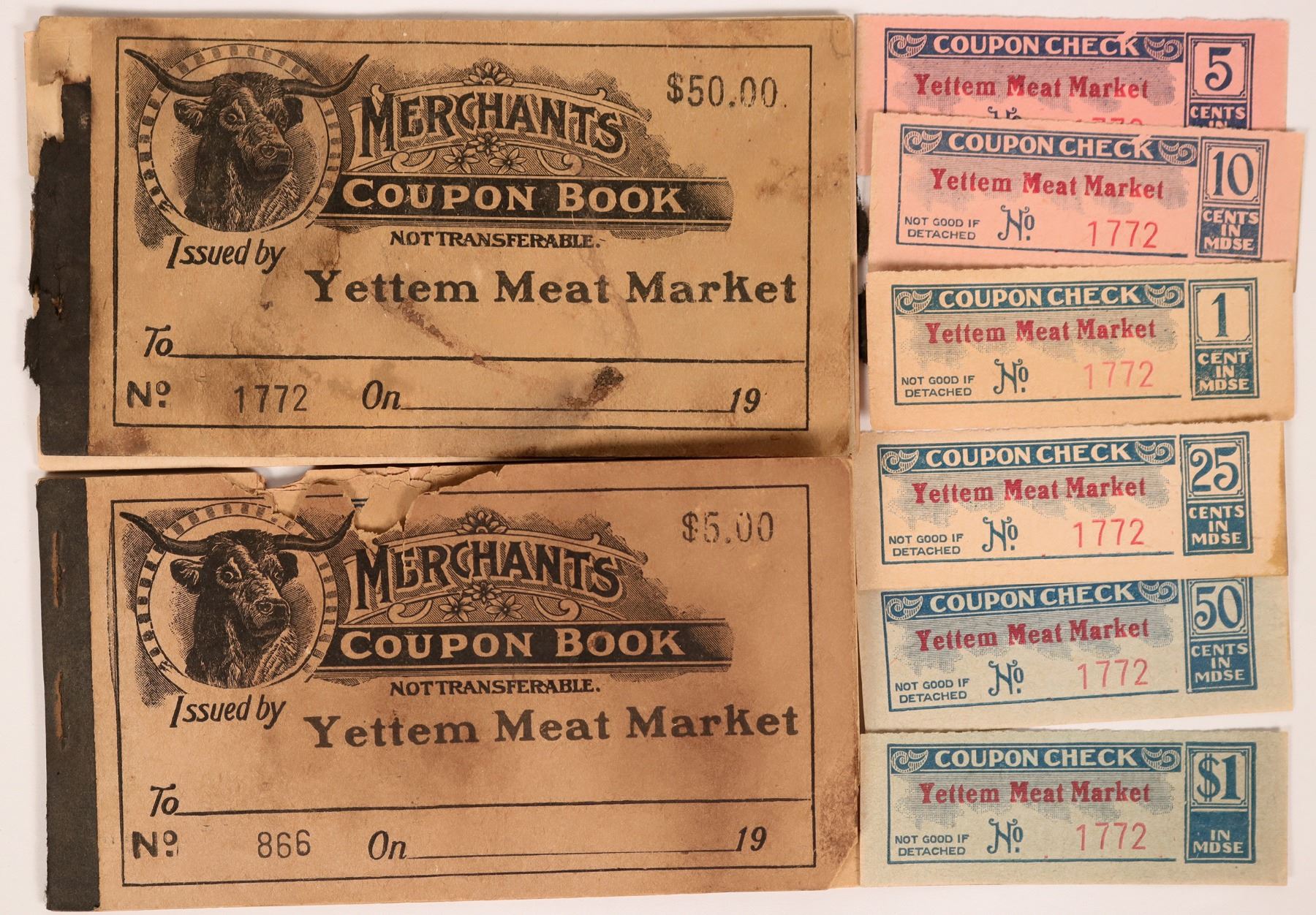 Eleven miles north of Visalia, two coupon books and five GF coupons from the Yettem Meat Market. Ex: Ron Lerch Collection.