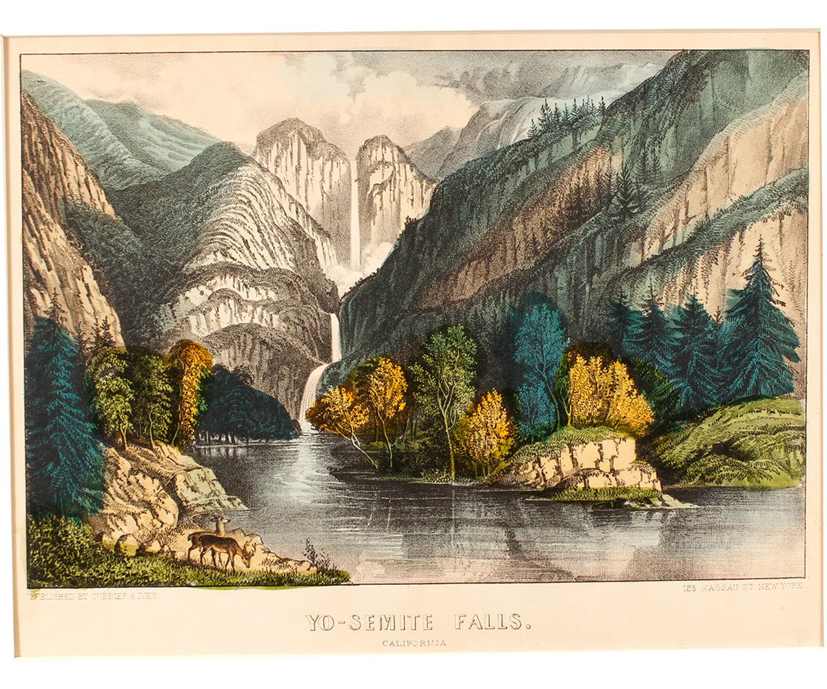 Vibrant and hand-colored. Currier & Ives present Yosemite in all its splendor, focusing on a flowing waterfall cascading down a mountain. Lithograph measures approximately 15 7/8 x 11 3/4 inches. Mounted on foam board. Published by Currier & Ives. 152 Nassau St. New York. (See "Looking Down the Yo-Semite" for more information.) Burger CollectionCity: Yo-SemiteCounty: State: CADate: