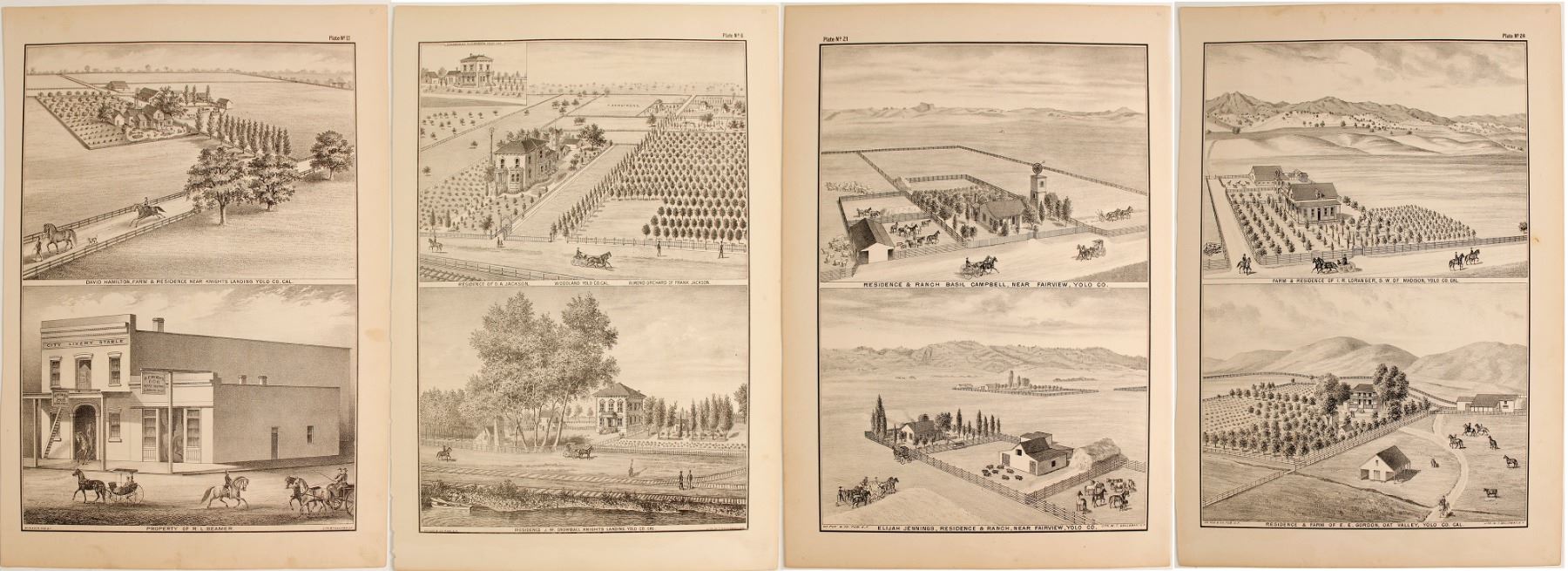 Lot of four views of Yolo County in horse and buggy days. Farm and residence of David Hamilton near Knights Langing; Property of R.L. Beamer; residence of D.A. Jackson in Woodland; J.W. Snowball, Knights Landing; Basil Campbell, Fairview; Elijah Jannings, Fairview; I.R,. Loranger of Madison; E.E. Gordon of Oat Valley. Each sheet 14 x 18 inches. City: Yolo County State: California Date: