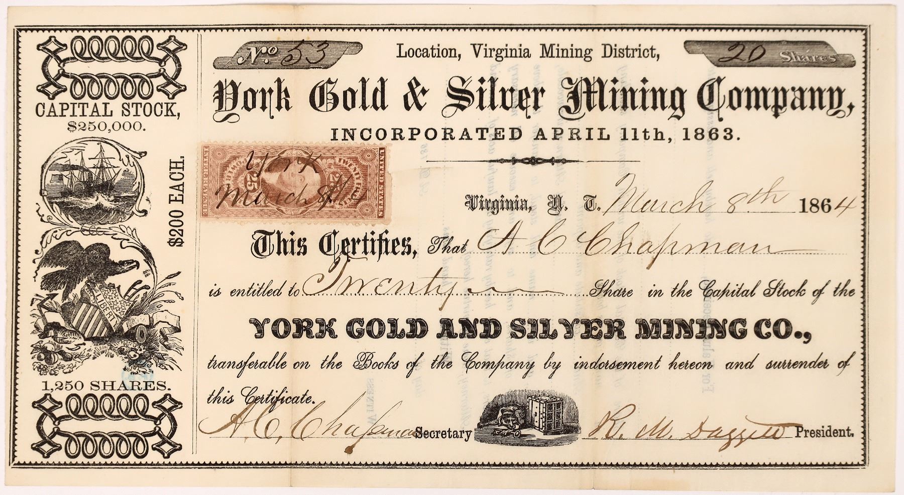 York Gold & Silver Mining Company Stock - Virginia City, Storey County NT Cert. #53, issued to A.C. Chapman for 20 shares on March 8, 1864. Signed by R.M. Daggett, president, and by A.C. Chapman, secretary. - Incorporated in Nevada in 1863 and capitalized at $250,000; 1250 shares at $200 per. Vignette column at left end with masted side-wheeler ship carrying an American flag, and an eagle atop a stars and stripes “Liberty” shield. Small vignette at bottom center of dog guarding a safe. Black border and print. Uncancelled. No printer noted. 5.25 x 9.” Not noted on Becker's map of 1883. The property is noted on Bancroft's 1865 map, located just north of the N. Ophir and the Mexican mines and the Summit Mill on the Comstock Ledge. Chapman was a partner in Armstrong and Chapman [Kelley, 1863]. Rollin Mallory Daggett was a notary public in the firm of Myers & Daggett in Virginia City [Kelley, 1863], and a partner with Myron Angel at El Dorado Canyon in 1862-63. He was born in 1832 in New York. “He must have been a strange queer genius, even in childhood” [Angel's History of Nevada]. He helped found the Golden Era newspaper in San Francisco, where he was a partner and contributor, then sold it and went to Virginia City in 1862 to work with Joseph T. Goodman of the Territorial Enterprise, alongside Mark Twain. Both Daggett and Goodman considered themselves literary lights as poets and playwrights. Daggett stayed on until 1879 becoming manager of the paper [Robt. Armstrong, Nevada Printing History, Univ. of Nev. Press, 1981, pg. 206]. He is the namesake of Daggett, California. Virginia City Nevada 1864