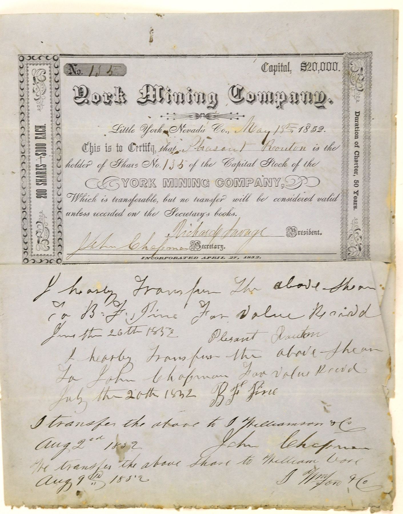 Very early California Gold Rush certificate. Inc. April, 1852. No. 155, issued for one share to Pleasant Routon on May 15th, 1852. Signed by Richard Savage as President and John Chapman as Secretary. Not cancelled. Black print on blue paper. The certificate is printed on one fourth of a sheet measuring 10 x 16 ¾ inches in the form of a four-page letter sheet. Writing below the certificate which is roughly 5" x 8 ½" documents the transfer of the cert. to BF Pine on July 20, 1852. Transferred two more times in 1852. On the inside (back of certificate) is another record of transfer to Joseph Gardiner November 5th, 1853. On back of the last page is a record of payment of eleven hundred dollars on Oct 31st, 1859. Printed by Herald Print, S.F. Some age toning and chipping at folds, rough edges. Little York was located two miles Southwest of Dutch Flat and about 9 miles Southeast of Nevada City. Active since 1849, the town was organized in 1852 when most of the miners that were there were from New York chose the name over St. Louis. Active lode and hydraulic mining continued in the area till 1884 when the outlawing of hydraulic mining forced closure of operations. The post office closed in 1886. (Ref. Gudde – Gold Camps, p.196.) The company was capitalized at $20,000; 200 shares at $100 each. Duration of charter, 50 years. According to the History of Placer & Nevada Counties (1924), the Little York Mine was located on the ridge dividing Bear River from Steep Hollow, at an elevation of 600 ft. above the river. Work began in June 1852. "The York Mining Company's ditch supplies the neighborhood with water." City:Nevada County State:California Date:1852
