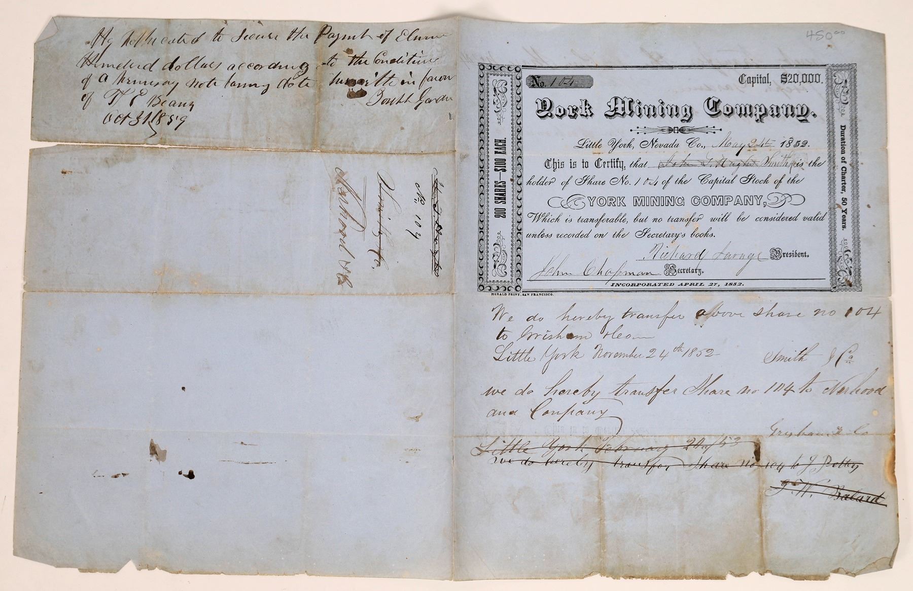 # 104 for 10 shares made out to Smith & Co. Dated May 24th, 1852. Little York was located two miles Southwest of Dutch Flat and about 9 miles Southeast of Nevada City. Active since 1849, the town was organized in1852 when most of the miners that were there were from New York and chose the name over St. Louis. Active lode and hydraulic mining continued in the area till 1884 when the outlaw of hydraulic mining forced closure of operations. The post office closed in 1886. [Gudde] Incorporated in California on April 27th of 1852. Signed by Richard Savage President and John Chapman, Secretary. The certificate is printed on one fourth of a sheet measuring 10 x 16 ¾ inches in the form of a four page letter sheet. Writing below the certificate which is roughly 5 x 8 ½ documents the transfer of the cert. to --- on November 24th 1852. On the inside (back of certificate is another record of transfer to Joseph Gardiner November 5th 1853. On back of the last page is a record of payment of eleven hundred dollars on Oct 3lst, 1859. Black on blue; printed by Herald Print, S.F. A very rare early mining certificate. Some chipping on edges otherwise fine condition.