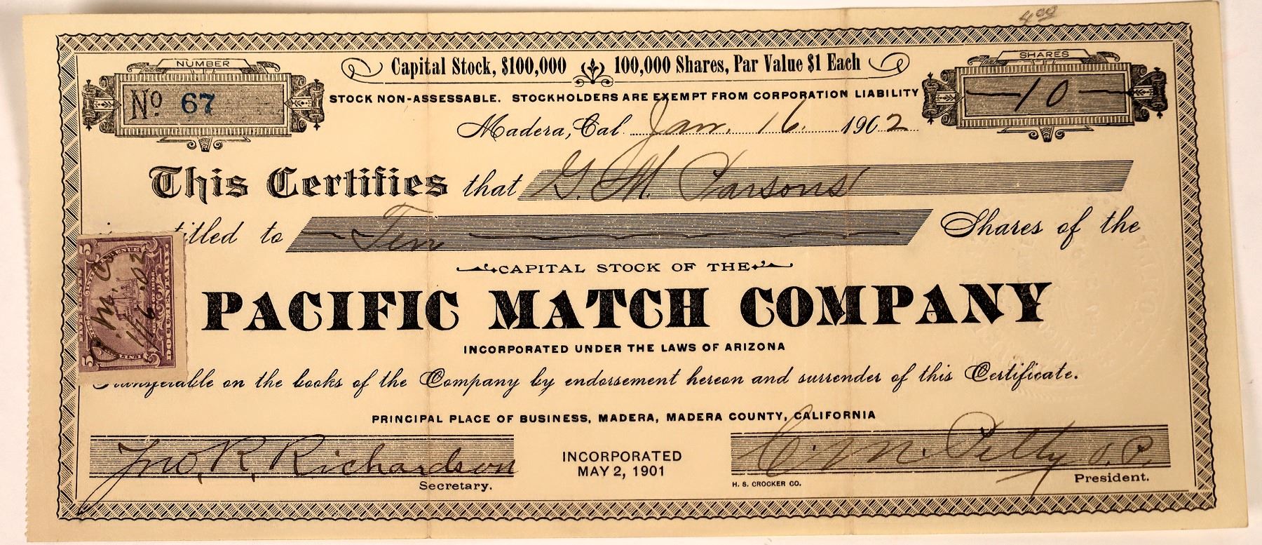 Stock certificate issued by Pacific Match Company for 10 shares at $1 per to G.M. Parsons. It is signed by secretary Richardson and president Petty. There's a five cent stamp affixed and small fold creases. Please see photos for more detail and condition.