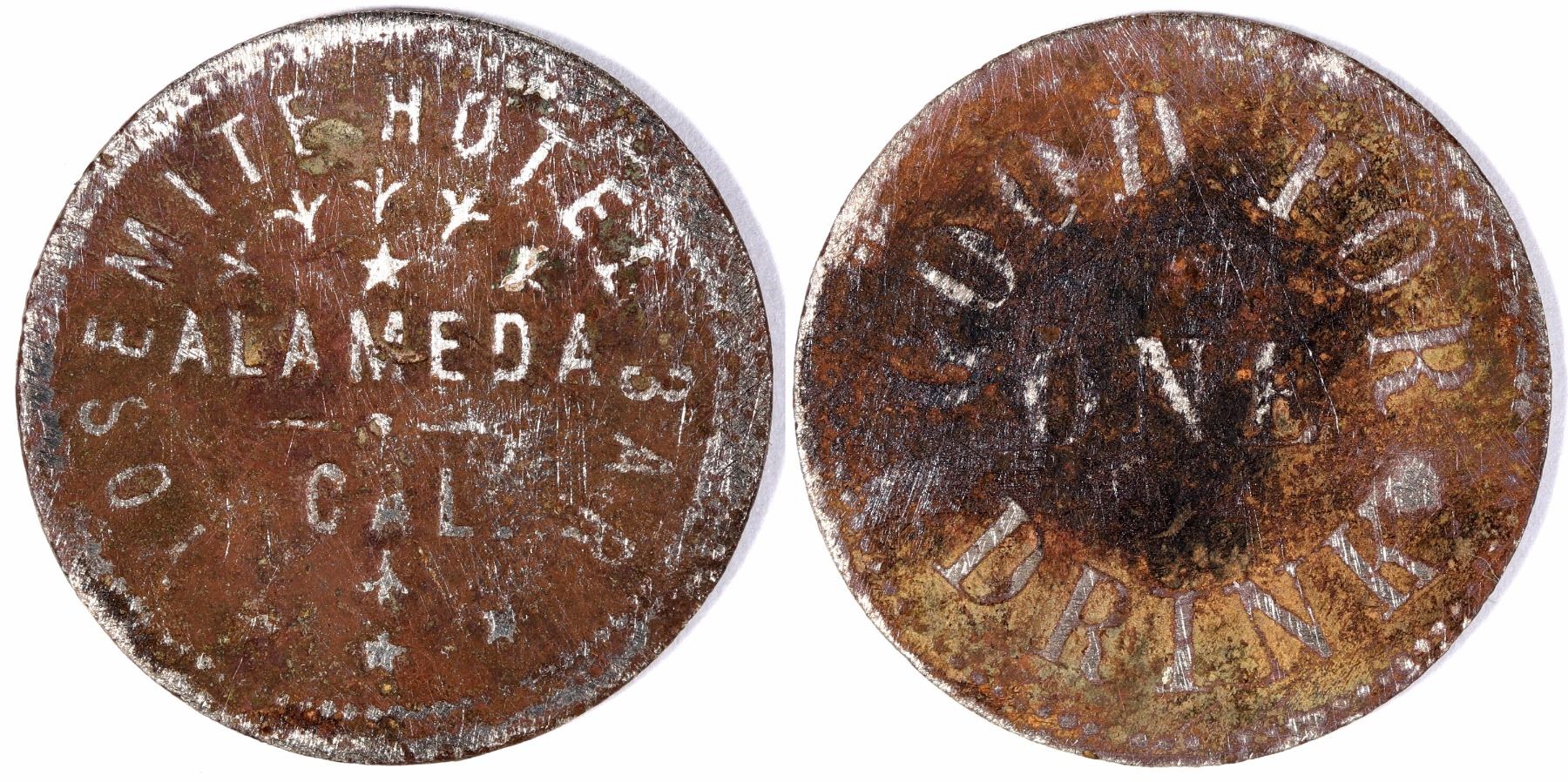 YOSEMITE HOTEL BAR / ALAMEDA / CAL. // GOOD FOR / ONE / DRINK; Wm, rd., 25 mm. Ex Ron Lerch collection.