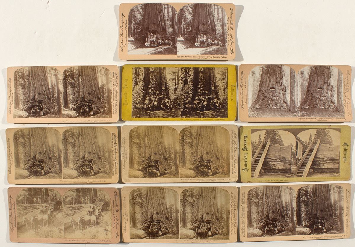 10 total, 8 different, stereoviews that feature the Mariposa and Calaveras Groves. Includes: "No. 23---Grizzly Giant 101 ft. Circumfrence 8 ft. from Ground" (Davis Brothers, low contrast); "Chip off the Old Block, Calaveras Grove" (no photographer, med. contrast); No. 5006--The Wawona Tree (Keystone, good contrast); No. 9485--The Empire State (Keystone, good contrast); No. 5007--The Fallen Monarch (Keystone, low contrast); and five stereoviews, three different that are c.1894 and titled, "Wawona, as we drove through it" showing wagon move thru tree. Unique group! (Prag Collection) City: Yosemite State: California Date: c.1890s hwac# 27125