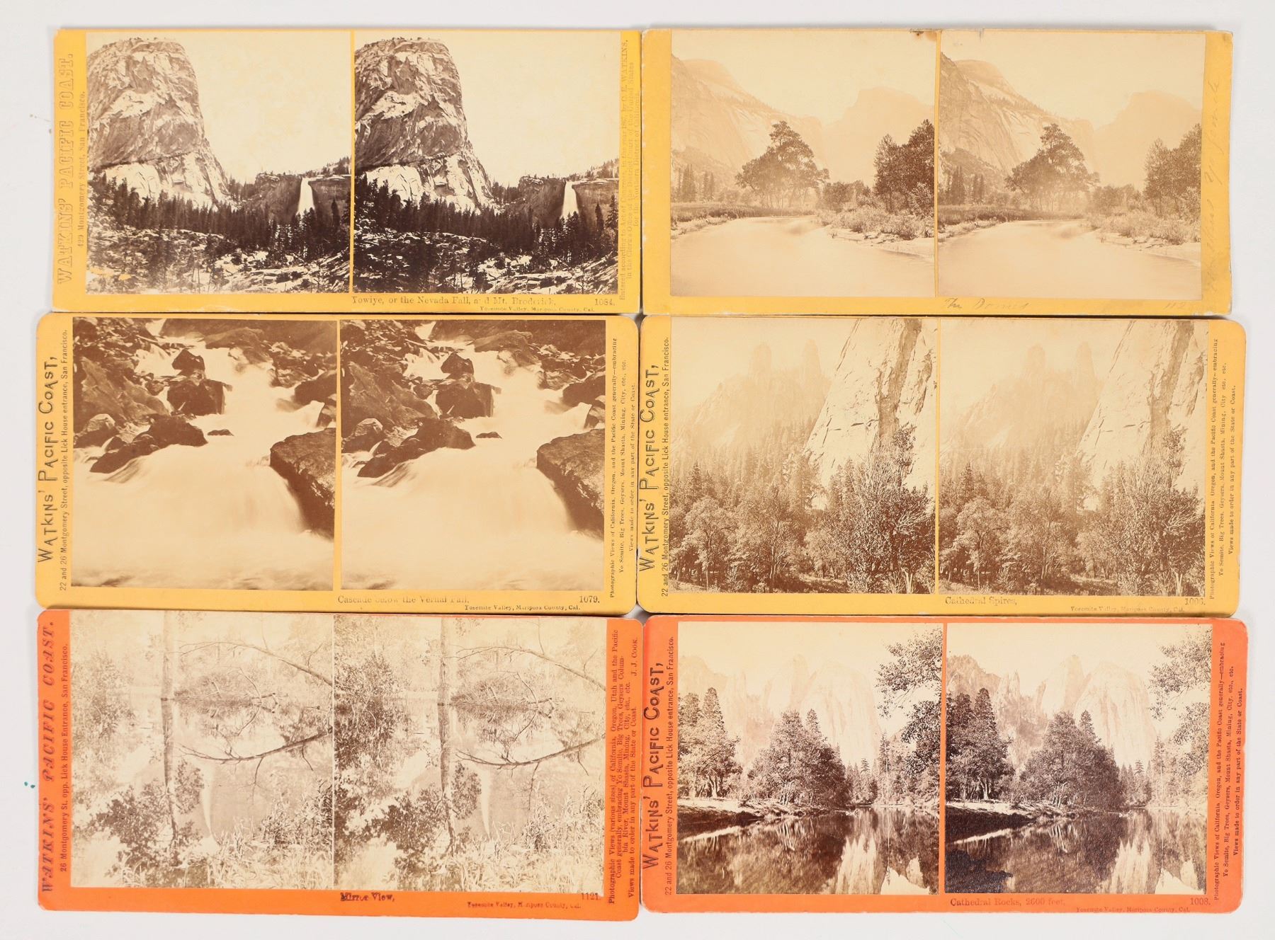 Lot of 6 different. Five are marked Watkins Pacific Coast: two are 22 & 26th Montgomery (c.1874); 429 Montgomery (1867); one 26 Montgomery (c.1874). Sixth is pen identified as Watkins No. 1128. Views of Nevada Fall, Cathedral Rocks, Vernal Fall, Half Dome, etc. Carleton E. Watkins (1829–1916) was a pioneering American landscape photographer best known for his large-format views of Yosemite and the American West, which helped inspire the creation of Yosemite as a protected reserve. Renowned for technical precision and dramatic composition, his mammoth-plate photographs set a new standard for 19th-century nature photography.