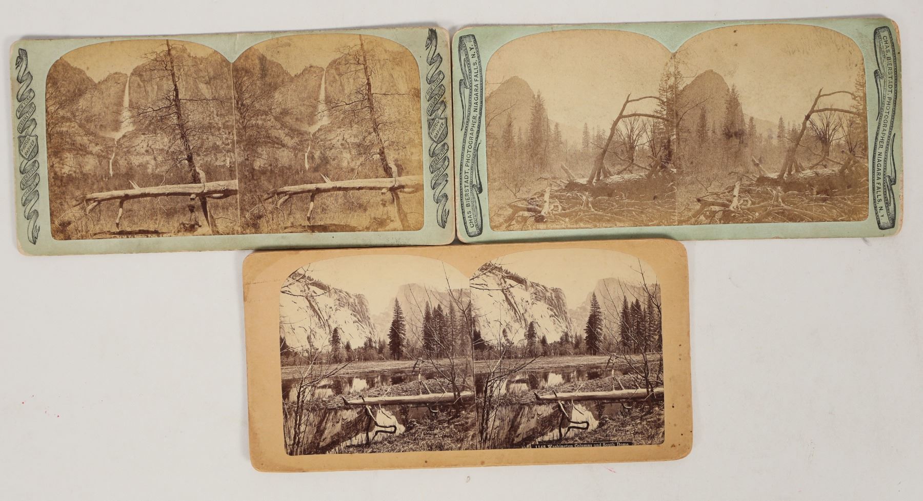 Lot of 3 different: Yosemite Falls, Cathedral Rocks, South Dome. Lists his office at Niagara Falls in New York. Bierstadt was from New Bedford, Massachusetts. He photographed Yosemite and other scenes in California in the 1860s. He was the brother of Albert Bierstadt, famous Hudson River School painter who did phenomenal western landscape scenes (of mostly California). (Mautz)