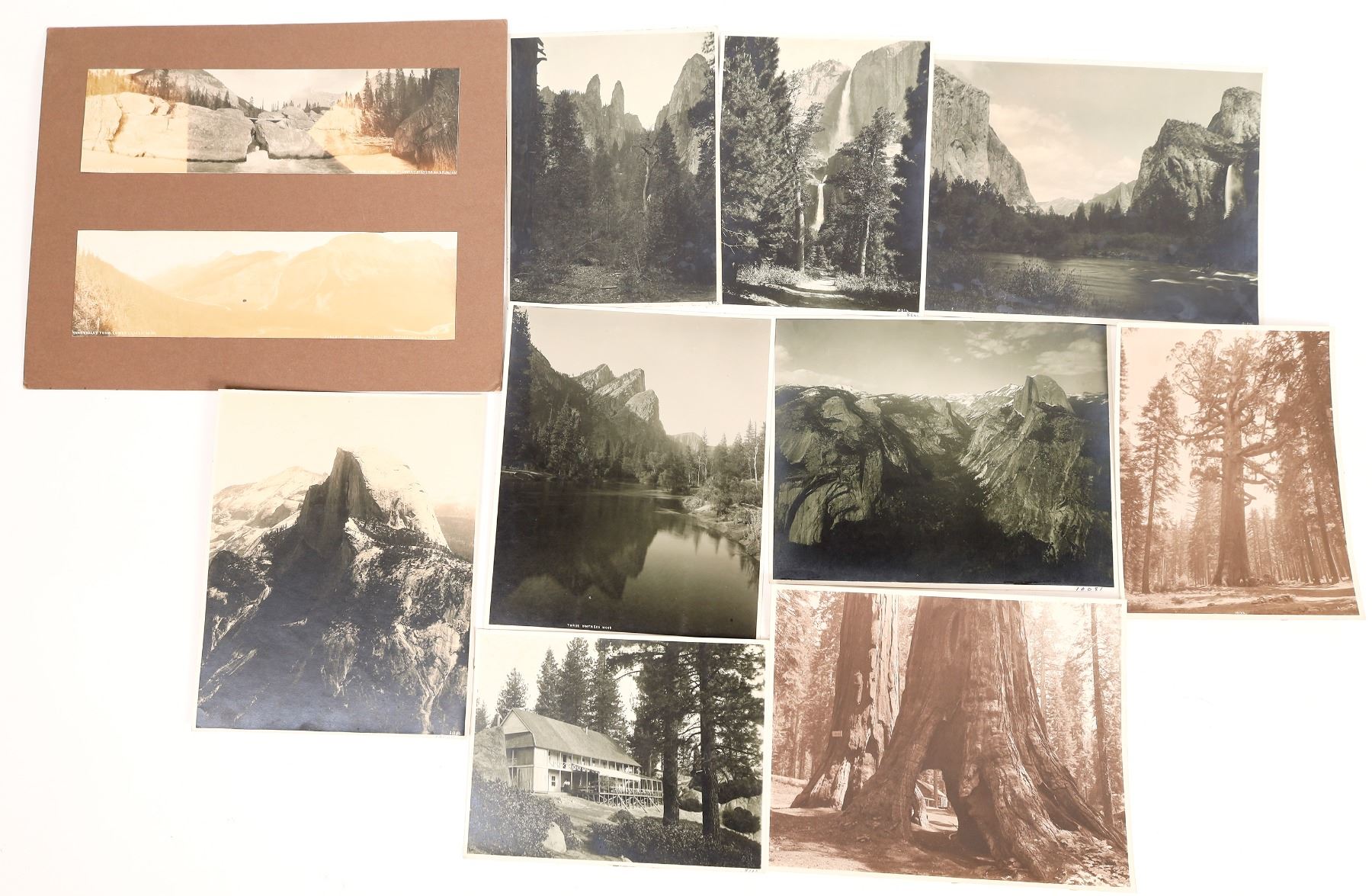 Contents of the Yosemite group include: Glacier Point Lodge about 1916, 6.25 x 8.125, #8104; Yosemite Falls , same size, #8080; Twin peaks (?), same size, #8085; drive-thru tree, same size, #10166, almost sepia-toned; lower portion of drive thru tree, possibly #10153 (blurred), almost sepia toned, about 9.75 x 7.75; Half Dome & valley (possibly from Glacier Point), same size, #10081; ìThree Brothers, no number, same size; Merced River and Yosemite Valley, same size, #10092; Half Dome, #10034, same size. Of this group there is an absolute stand-out, exceptional photograph of the highest quality- contrast, focus, context and content, which is the view of Yosemite Falls. It is worthy of any museum, and clearly shows the ability of the photographer to capture great depth of field while not sacrificing contrast and focus.
