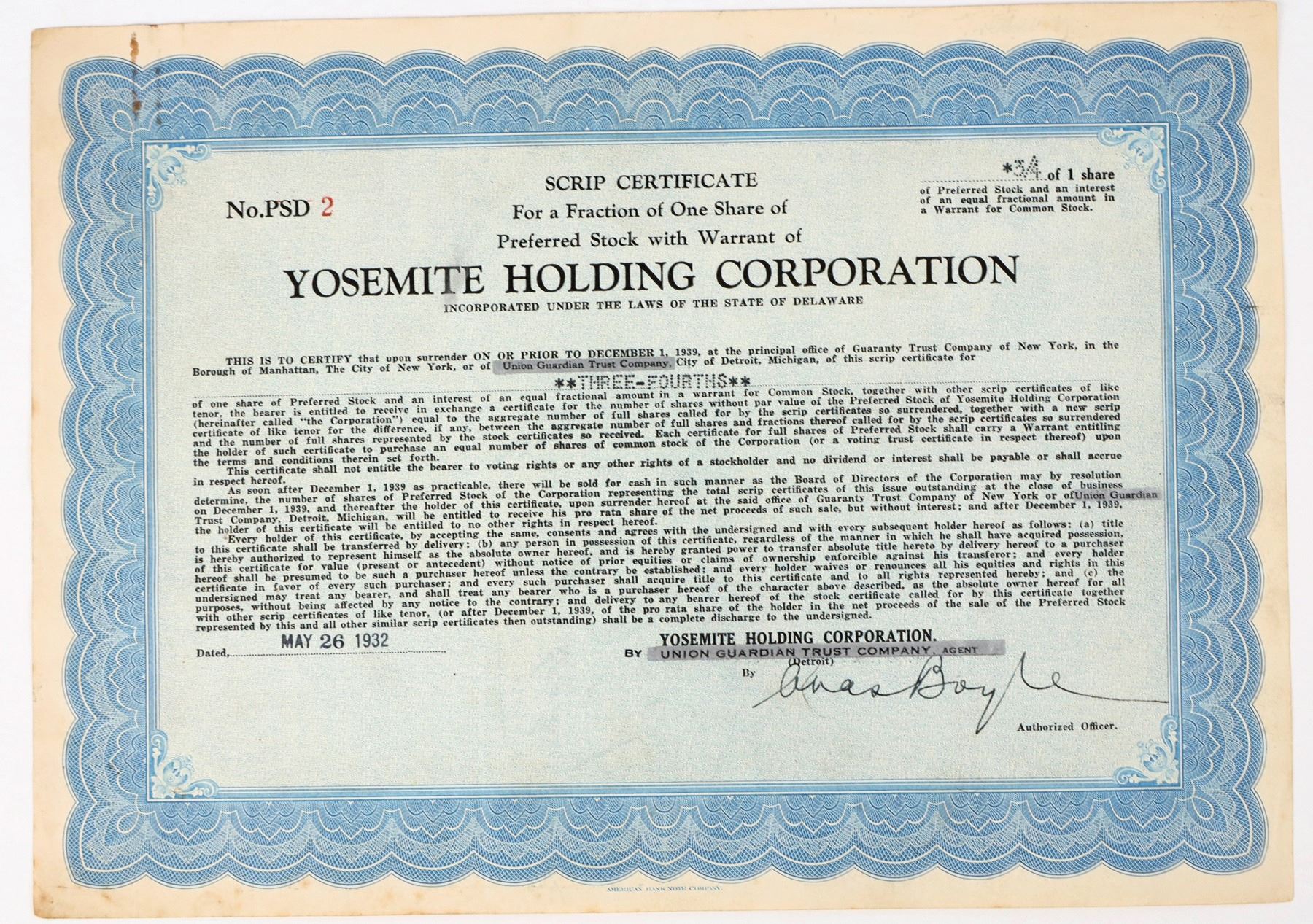 Scrip certificate no. 2, issued in 1932. Blue border, black print. This company was an investment company in Detroit, Michigan associated with Charles Kettering, vice president of General Motors. Numerous articles appear about investigations into it.