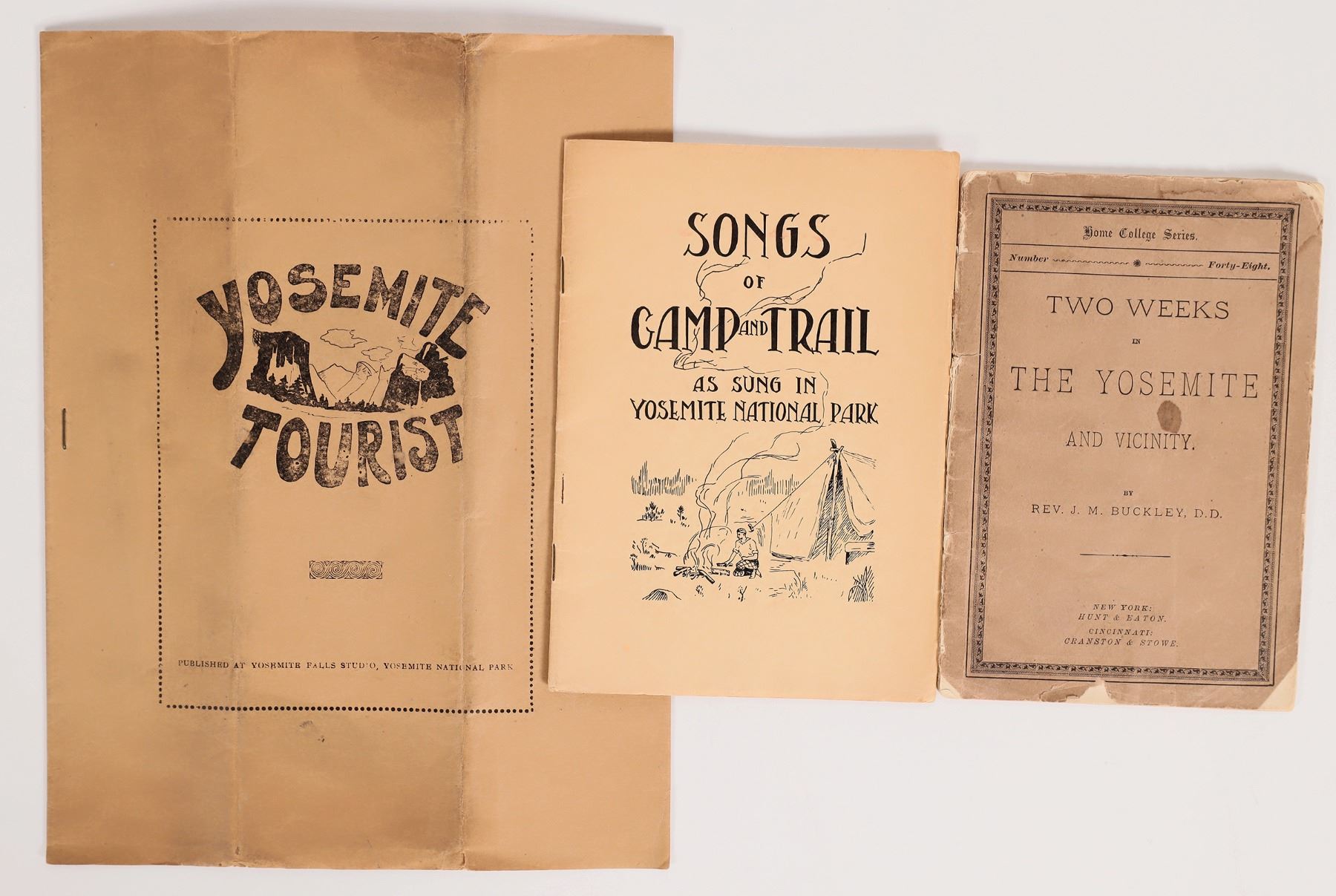 3 rare Yosemite National Park booklets. Songs of Camp and Trail as Sung in Yosemite National Park, with etchings, undated. Two Weeks in The Yosemite and Vicinity by Buckley, c. 1883, 34pp, Cathedral Rock etching inside front cover. Some pencil highlights, several cover chips. Yosemite Tours by Yosemite Falls Studio c. 1926, ad on back page for photographer Frederick W Martin. 2 vertical creases. Please inspect.