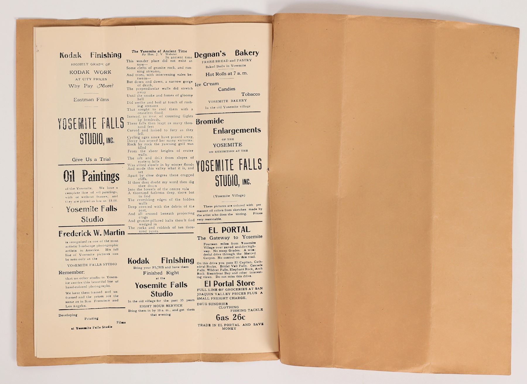 3 rare Yosemite National Park booklets. Songs of Camp and Trail as Sung in Yosemite National Park, with etchings, undated. Two Weeks in The Yosemite and Vicinity by Buckley, c. 1883, 34pp, Cathedral Rock etching inside front cover. Some pencil highlights, several cover chips. Yosemite Tours by Yosemite Falls Studio c. 1926, ad on back page for photographer Frederick W Martin. 2 vertical creases. Please inspect. Yosemite Park California