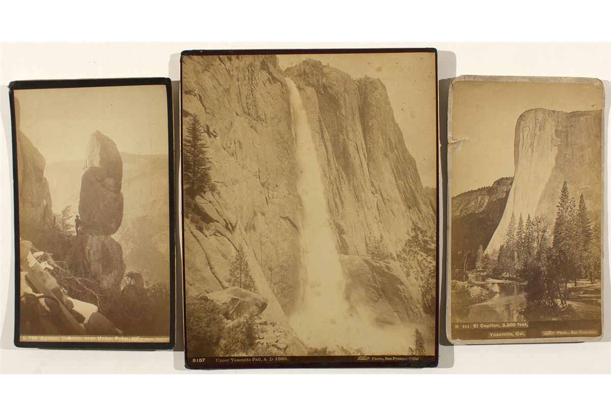 Lot of three Taber photographs mounted on heavy cardstock. 1) No. 5157. Upper Yosemite Fall, A.D. 1890. Taber Photo, San Francisco, Cal. Measures 10" x 8" with low contrast and some soiling. 2) No. B 725. Agassiz Column, near Union Point. (View of man next to rock tower). Card is bowed. Contrast low to medium. 8.5"x 5.25" 3) No. B 411. El Capitan, 3,300 feet, Yosemite, Ca. Medium contrast. 3/4" tear upper left edge. Also 8.5" x 5.25" I.W. Taber (1830-1912) opened his first studio in San Francisco in 1871 and reproduced many of the photographs of Carleton Watkins, without credit. His studio was destroyed in the 1906 earthquake. (Prag Collection)