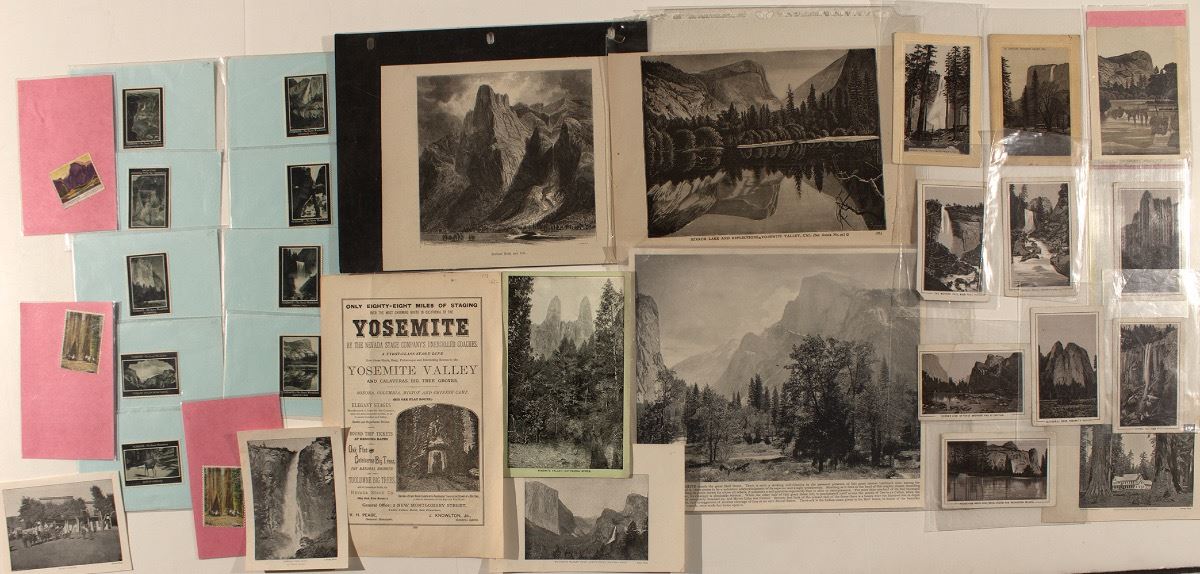 Lot of 19. Includes: handbill (10" x 6.25") advertising the Nevada Stage Co.'s stagecoach to Yosemite (taken out of a book), eight smaller prints (4.25" x 2.75"), one small print by the Jersey Coffee Co. (4.75" x 3.25"), four different Perkins photos (approx. 3" x 4.25") taken out of a book, print of Sentinel Rock and Fall (7.25" x 8.75"), print of Mirror Lake (7.25" x 10.5"), print of Cathedral Spires (7.25" x 4.5"). All are prints of etchings. Photo prints from book of Half Dome in Yosemite and Ostrich Farm. Please inspect! (Prag Collection) City: Yosemite State: California Date: ID# 27147