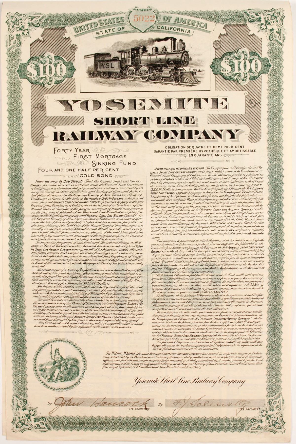 #5022 $100 40 year first mortgage sinking fund 4.5% gold bond. All coupons intact. Locomotive and tender vignette. Signed by President Solinsky. Nice condition. Prag Collection. State: City: Date: HWAC# 83278
