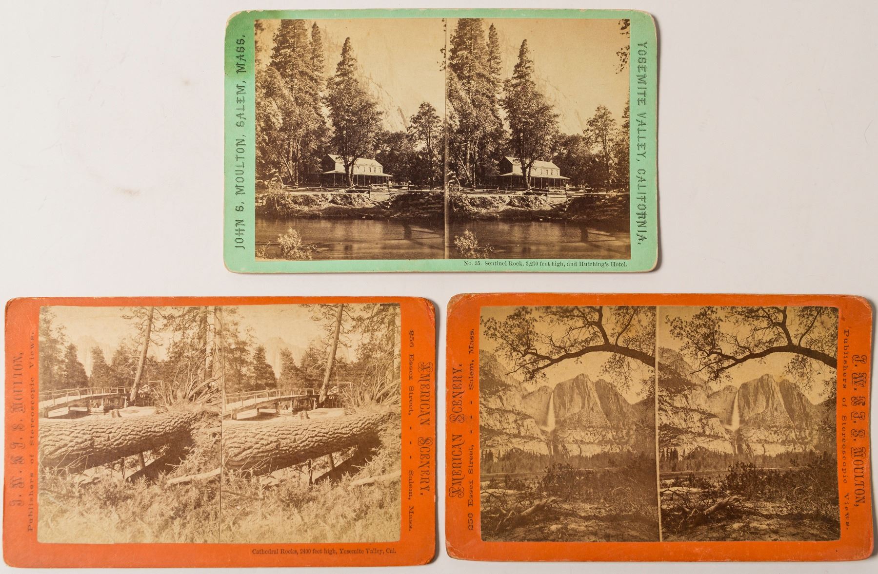 Lot of three stereoviews (4" x 7") from John S. Moulton (Salem, Massachusetts). Best card is No.35 view of Hutchings' Hotel with Sentinel Rock in the background. Staining upper left corner. Other two cards are scenery: Cathedral Rocks and Yosemite Falls. Medium contrast. (Prag Collection)