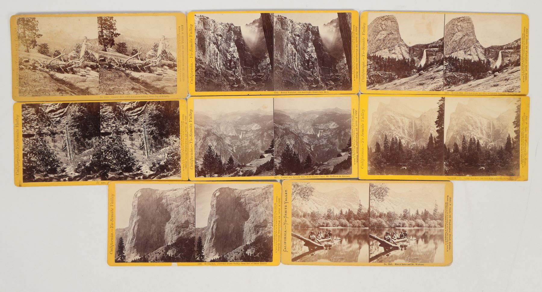 Lot of 8 different, all copyright 1870. Views of Mirror Lake, El Capitan, Bridal Veil Fall, Nevada Falls, and Vernal Falls. John Payson Soule (1828–1904) was an influential American photographer and publisher who opened a Boston studio around 1859, producing stereographic views and documenting landmarks, landscapes, and events such as the city's 1872 fire. In the 1880s he traveled west to photograph Colorado and Utah before relocating to Seattle in 1888. There he continued his work, notably photographing the Seattle Fire of 1889, until his death.