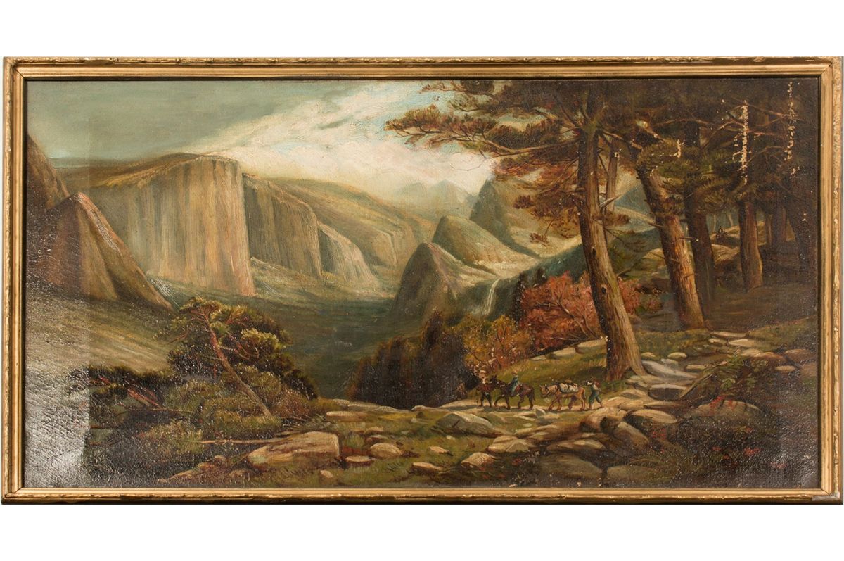 Oil painting (27.5" H x 37.5" W) of Yosemite Valley with horses and people. Artist unknown.