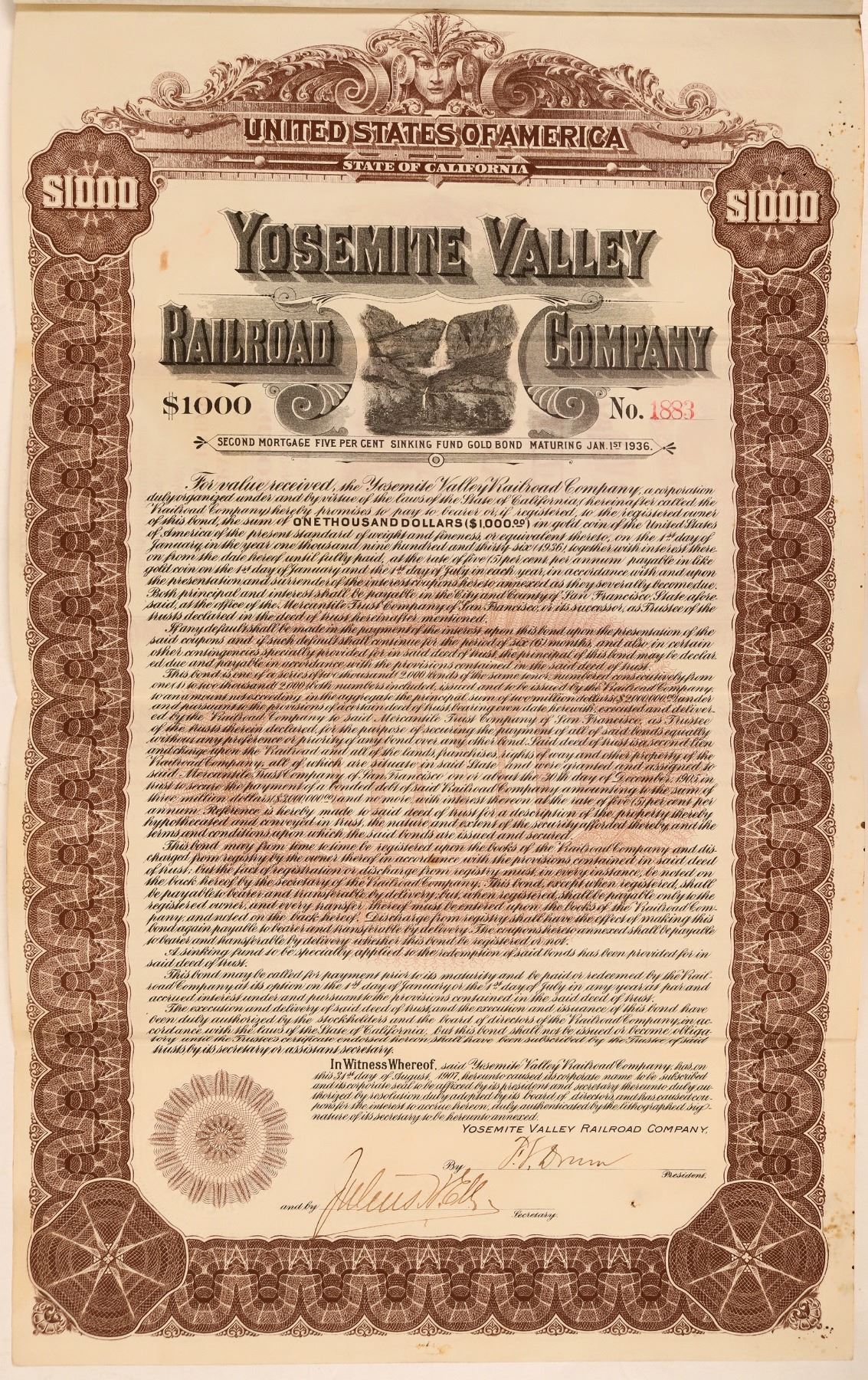 Dated 1907. Vignette of Yosemite Falls. Attached sheet of 23 coupons. Hand-signed by the president and secretary. Issued and uncancelled. Second mortgage bearer-bond. Extremely Rare. Possibly two known; one from the Prag Collection and this one.