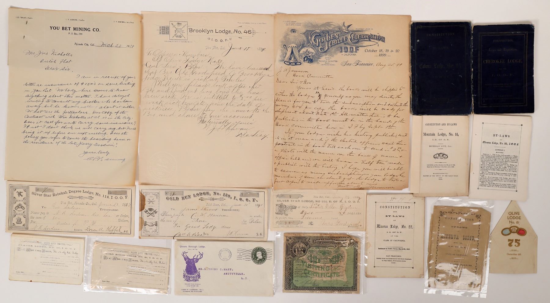 You Bet, Nevada County Mining Company, along with several items from The Odd Fellows Cherokee Lodge, as well as Brooklyn Lodge, Gold Run Lodge, Queens Borough Lodge, Silver Star Rebekah Degree Lodge and more. Please see photos for more details. California You Bet 1800s-1900s