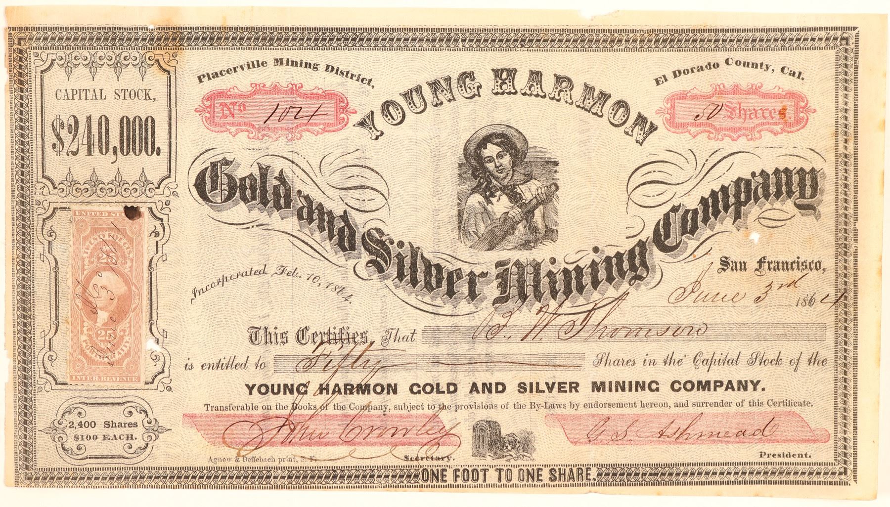 Placerville Mining District, El Dorado County, Cal. (printed along top). Inc. Feb. 10th, 1864. No 104, issued for 50 shares to BW Thomson on June 3rd, 1864 in San Francisco. Signed by president G.S. Ashmead and secretary John Crowley. Not cancelled. Black border and print, grey background and red boxes for numbers and signatures. Small vignette of a young boy with an oar in his hand. Printed by Agnew & Deffebach, SF. One 25 cent adhesive IR stamp attached on the left, pen cancelled. Folds, a few nicks along the edges, small stains, and a couple of holes in the stock. 5.25 x 9.5" Not in Filer or Holabird indexes. Browne (1868) reports the Harmon Mine as being 1,400 ft. long, just north of Placerville on a vein that is 100 yards west of the Pacific lode. The vein averages 4-5 feet wide, though reaches up to 30 ft. Browne says it was worked successfully with arrastras and paid well. They erected a 15 stamp mill that was not profitable and is idle. They are having trouble reducing the undecomposed sulphurets found below the water-line. The vein is quartz with seams of black slate and sulphurets of iron and lead (pg. 87). Ken Prag Collection