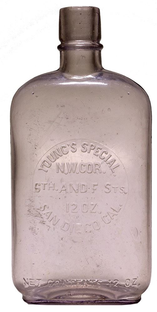 Youngs Special. Northwest Corner of Sixth & F Streets. San Diego, Cal. 12 oz. Embossing in round slug plate. Pint pocket flask, tool top, clear, turning purple. Extremely rare. City: San Diego State: California Inventory Number: 39524