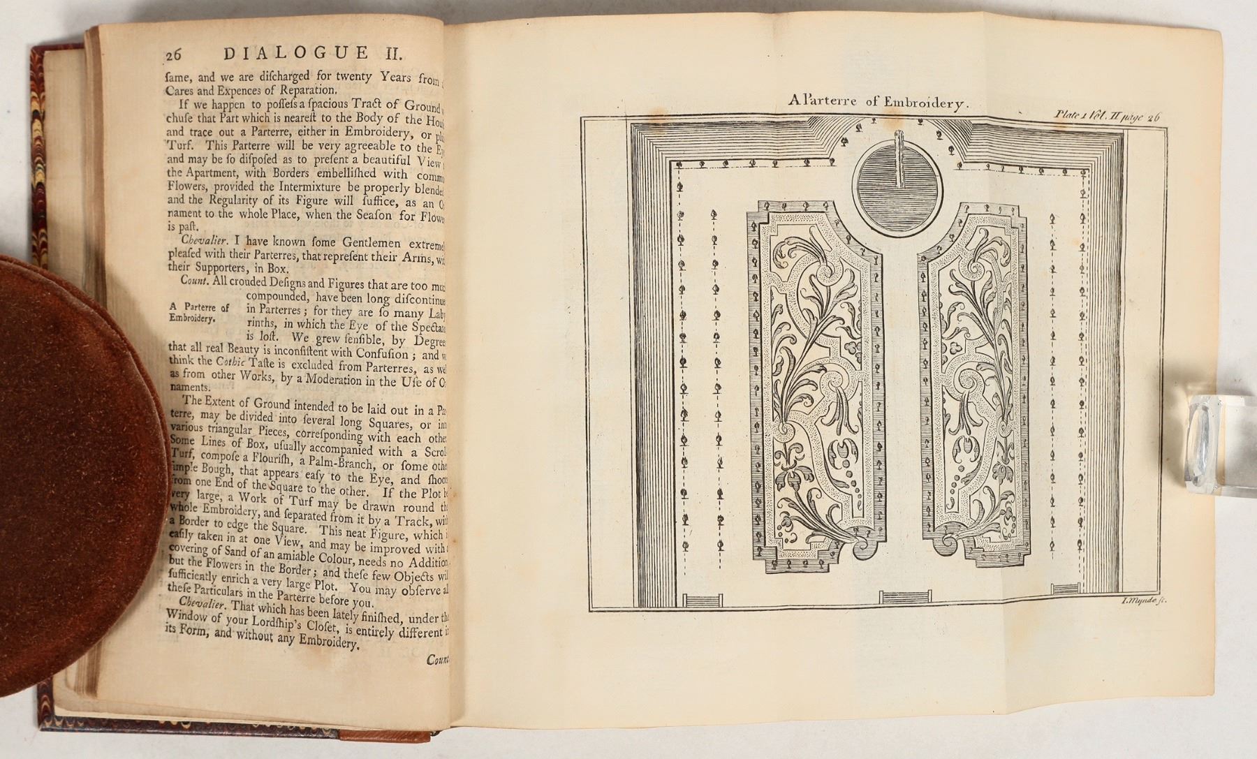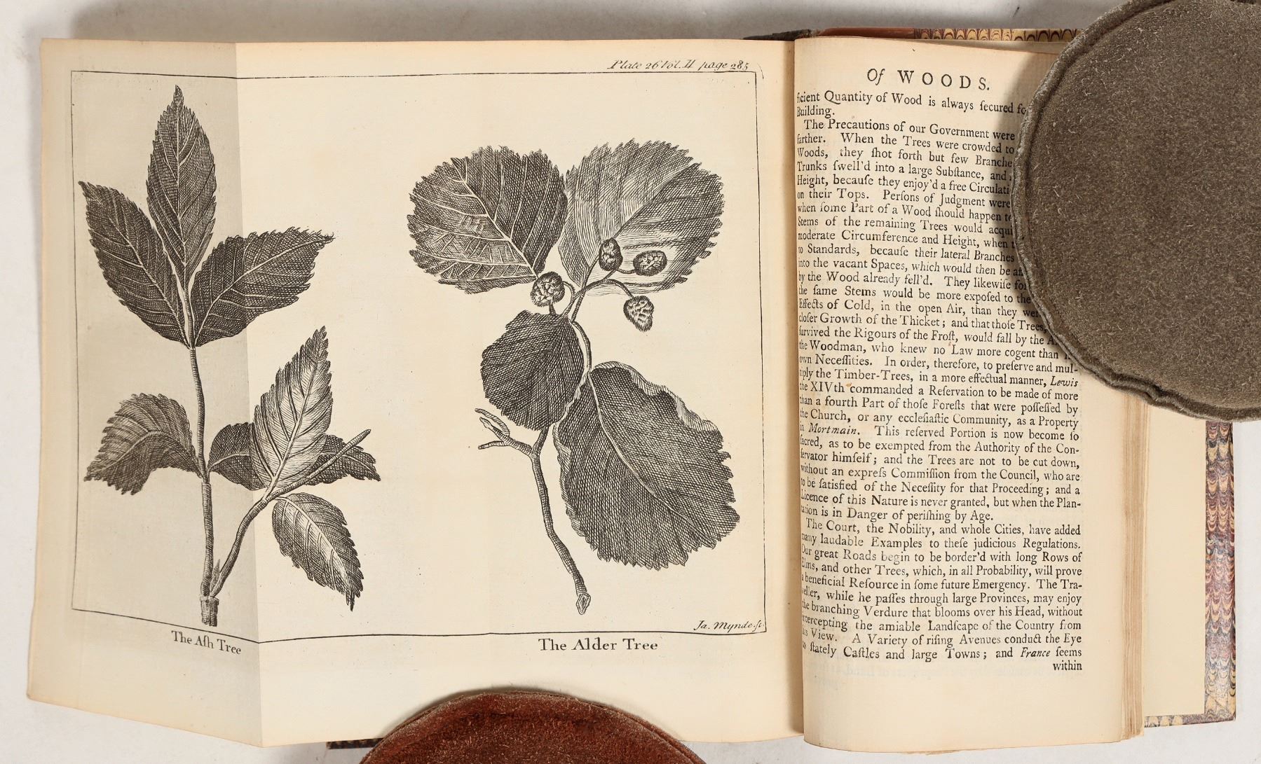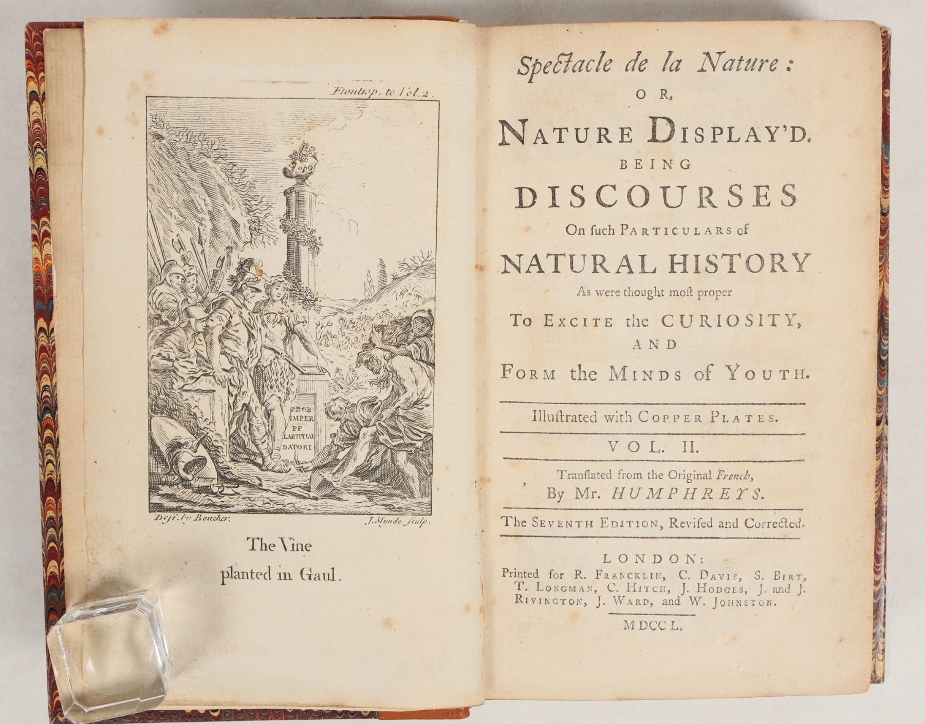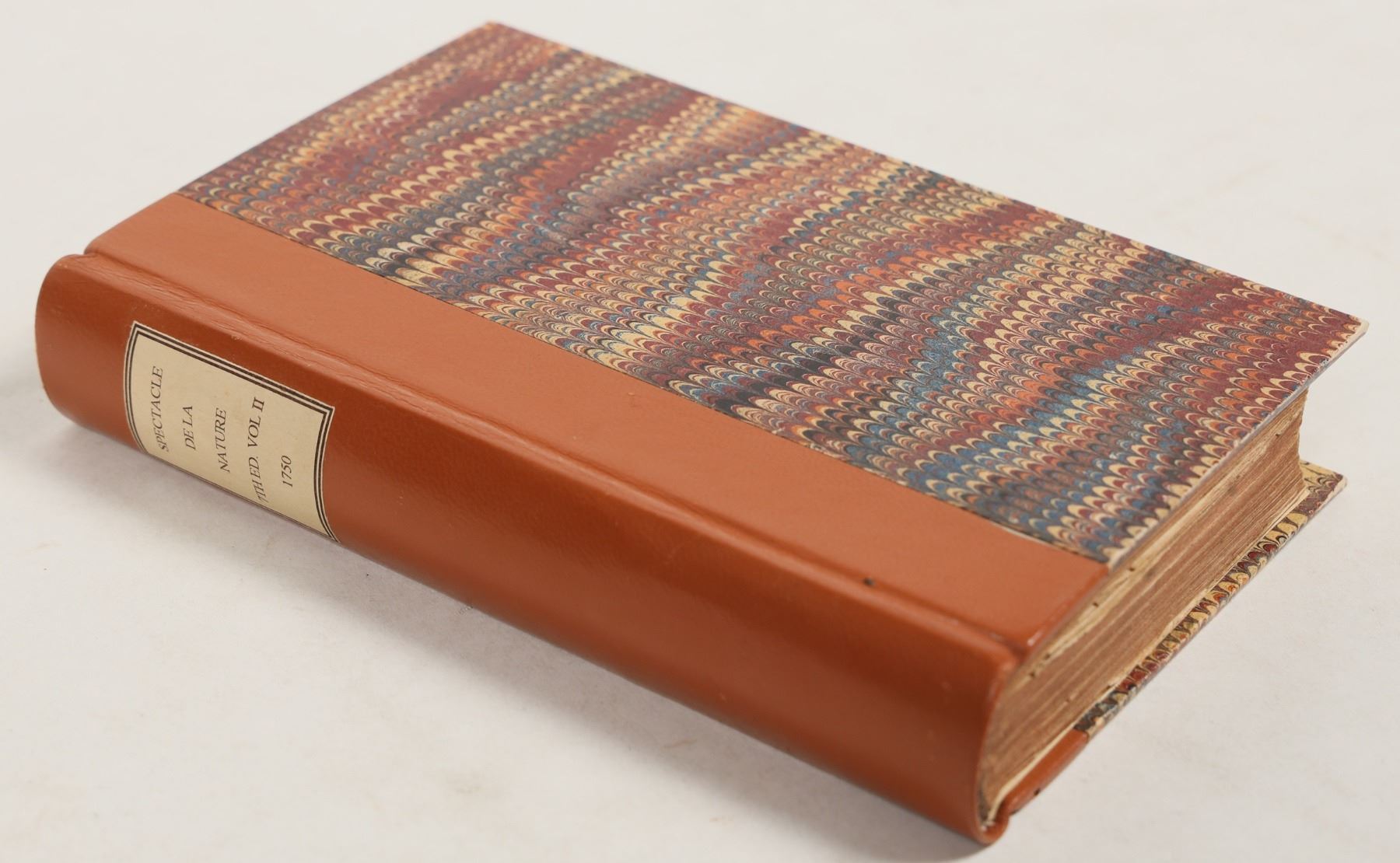 A copy of "Spectacle de la Nature: Or, Nature Display'd, Being Discourses on such Particulars of Natural History" Volume II, a natural history guidebook meant to "Excite the Curiosity and Form the Minds of Youth". The book, which was translated from the original French, was published in 1750 and printed in London. The book is illustrated with 34 copper plates depicting plants, mechanical apparatuses, birds-eye views of land developments, and more. Appears to have been rebound at some point with excellent marbled paper cover and leather spine. Notable foxing/toning on pages; see photos.