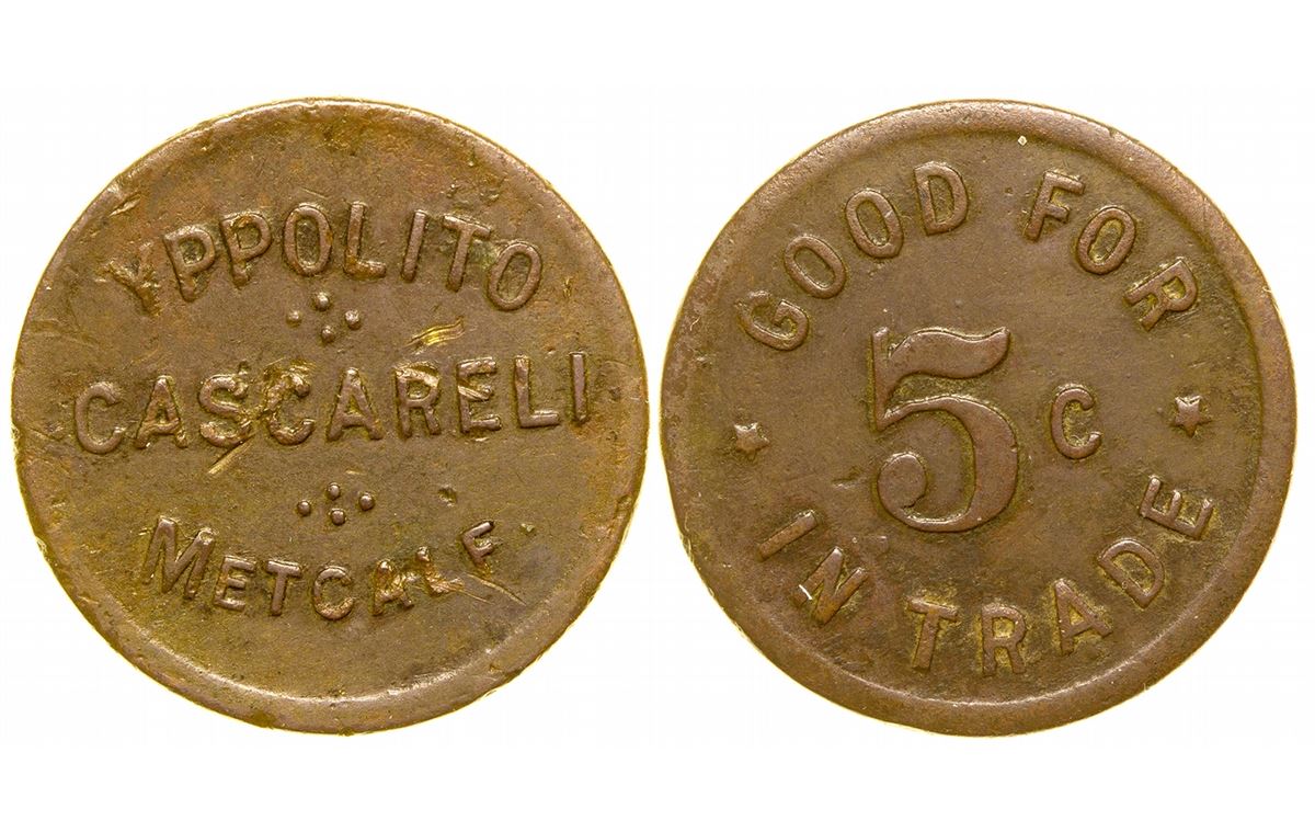 Obv.: Yppolito / Cascareli / Metcalf ; Rev.: Good For / 5c / In Trade; Br., 21mm, R8.