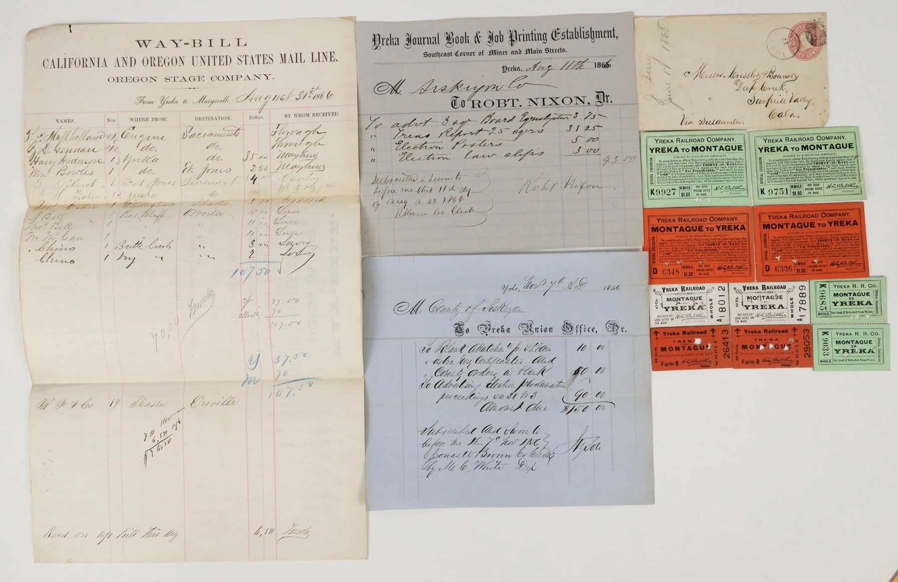 Yreka Ephemera w/Early 1850-1860s Pieces including: Waybill from California and Oregon Mail Line/Oregon Stage Company dated 1866, 1868 Surprise Valley Cover, Yreka Journal Book & Job Printing document dated 1865, Yreka Union Office document 1856, and Yreka Railroad Company tickets.