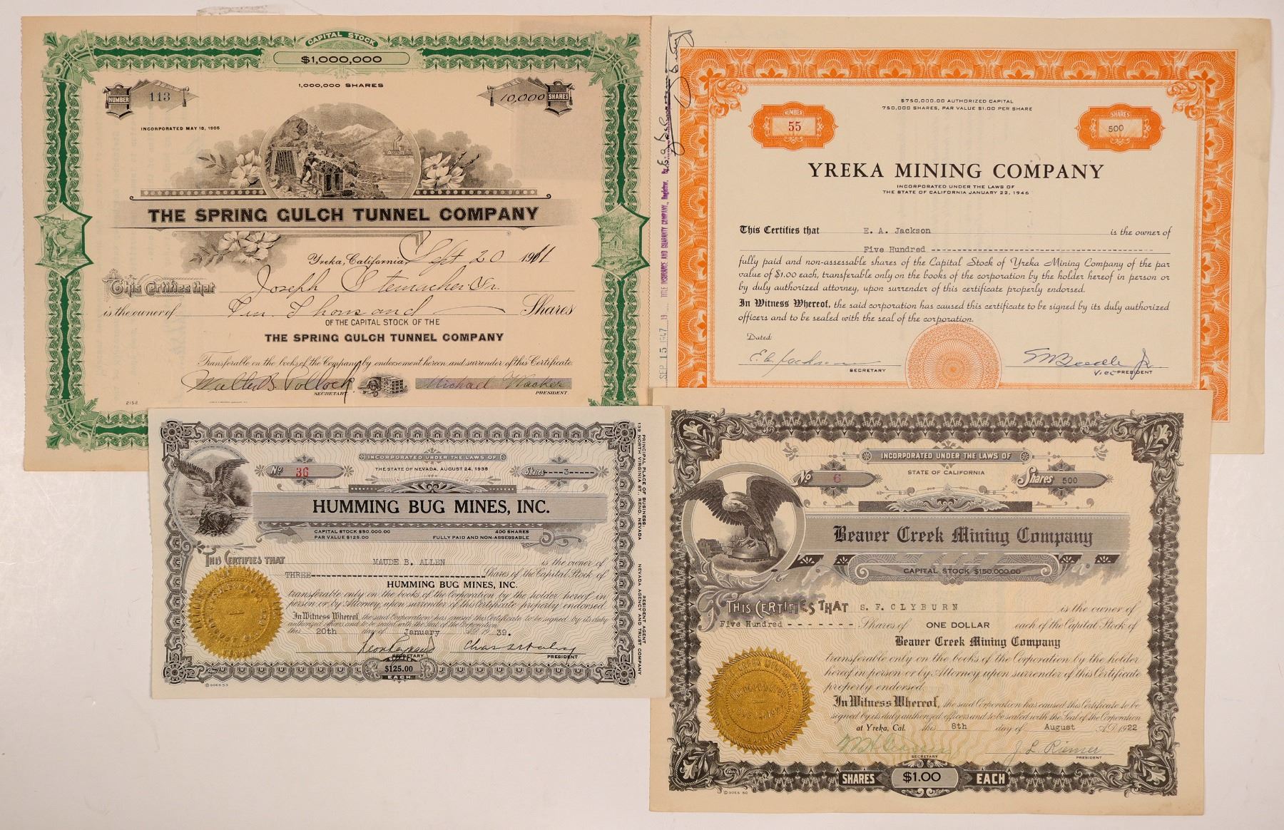 Lot of 4 different. 1) Humming Bug Mines, Inc. Issued in 1939, not cancelled. Eagle vignette. Staple holes, folds. 2) Spring Gulch Tunnel Company. Issued in Yreka in 1911, not cancelled. Vignette of miner pushing ore cart out of mine. Pinholes, folds, toning. 3) Beaver Creek MC. Issued in 1922, not cancelled. Eagle vignette. Folds. 4) Yreka Mining Company. Issued in 1947, not cancelled. Staple, folds, some toning. Yreka California Ken Prag Collection