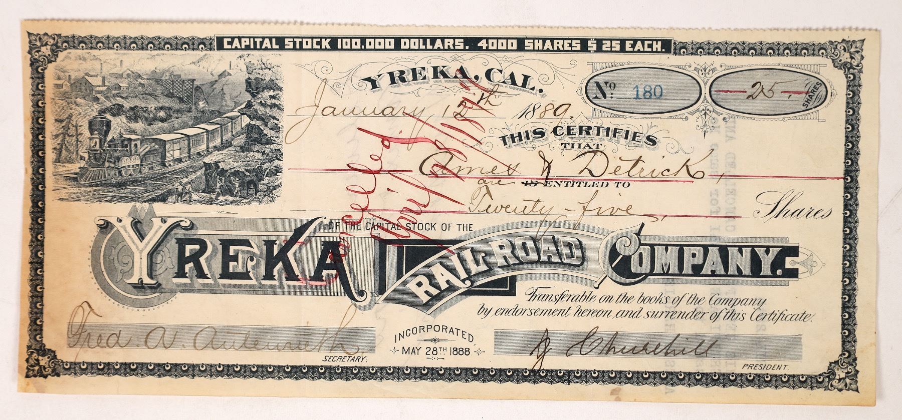 Extremely rare. Incorp. May 28 1888 State of Calif. #180, I/C, 25 shares of capital stock @ $25.00 ea. to Ames Detrick Jan 12,1889. Signed J. Churchill pres. and Fred A. Auteurieth sect. Blue border and print. Vignette upper left 4-4-0 tender and cars passing miners w/mine in background. TRi-fold, some discoloration left border, EF cond.