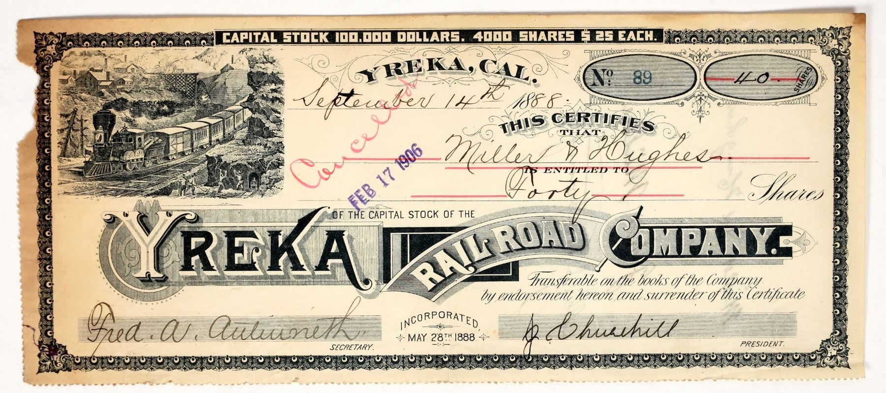 No. 89, issued for 40 shares to Miller & Hughes in 1888. Signed by president J. Churchill and the secretary. Pen cancelled. Nice locomotive vignette. Pinholes, folds, toning, piece missing on left border. 4.25 x 9.5" Located at Yreka, Siskiyou County, this short line only ran between Yreka and Montague. Today it operates the "Blue Goose," a tourist run between the two towns. The Yreka Railroad Co. was incorporated in May 1888 opened in January 1889, connecting Yreka to the Southern Pacific Company lessor Central Pacific Railroad ( former California and Oregon Railroad). Decision to build the Yreka Railroad was partly due to the Southern Pacific's decision to bypass Yreka in favor of a shorter, and more level route through the Shasta Valley and the city of Montague. Citizens of Yreka formed their own railroad so they wouldn't be without one. Used to move passengers and local freight. In August 1933, was re-incorporated as the Yreka Western Railroad Company. Union Pacific Railroad acquired the SP connection at Montague in 1995.