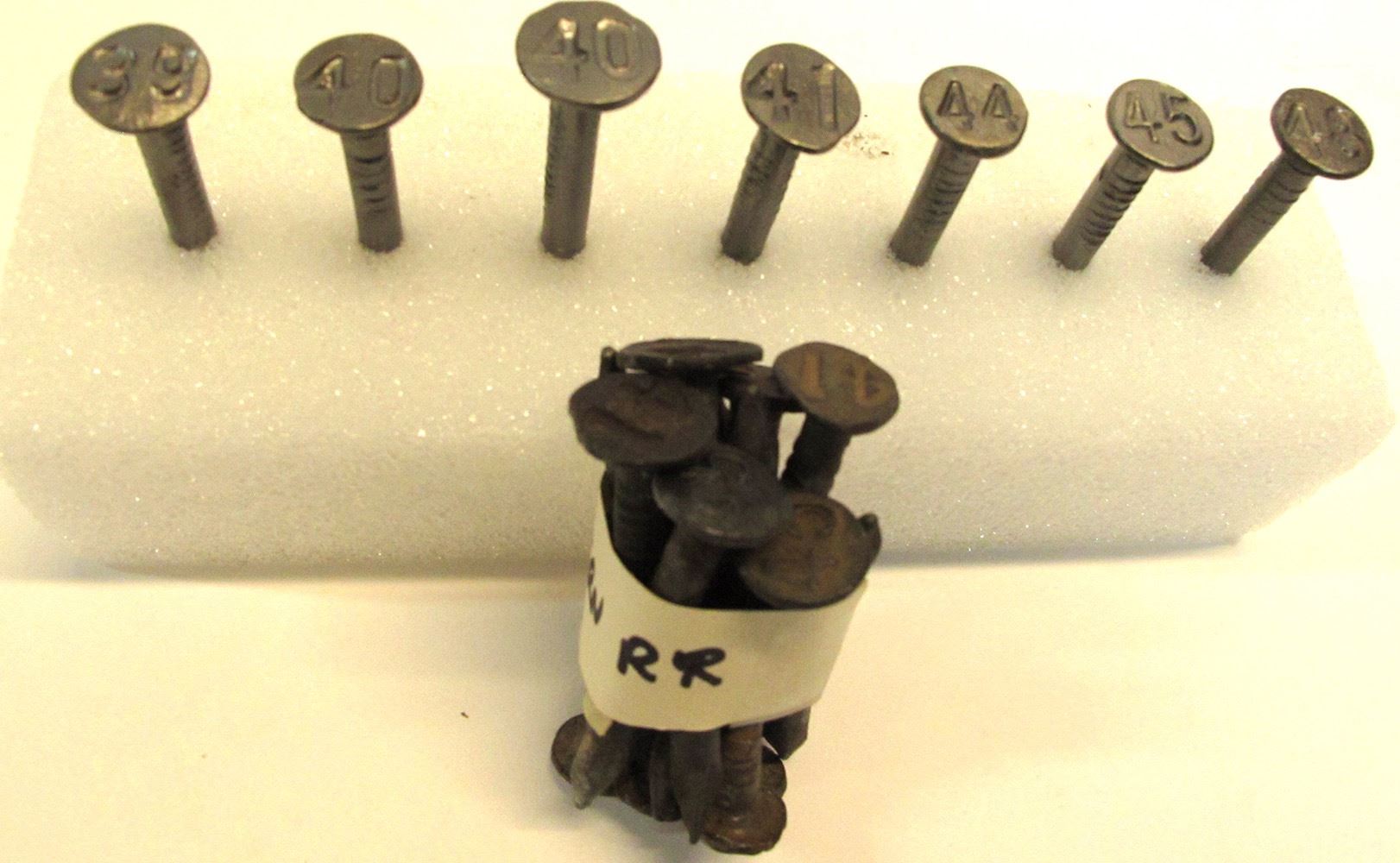 Date Nail Set from 8-mile shortline Yreka Western Railroad in CA that has operated from 1933 to date. This is a complete set and includes 7 steel nails with dates from 1939 to 1948. Includes 12 extra dates. Found along the railroad. Date: Location: California HWAC# 571905
