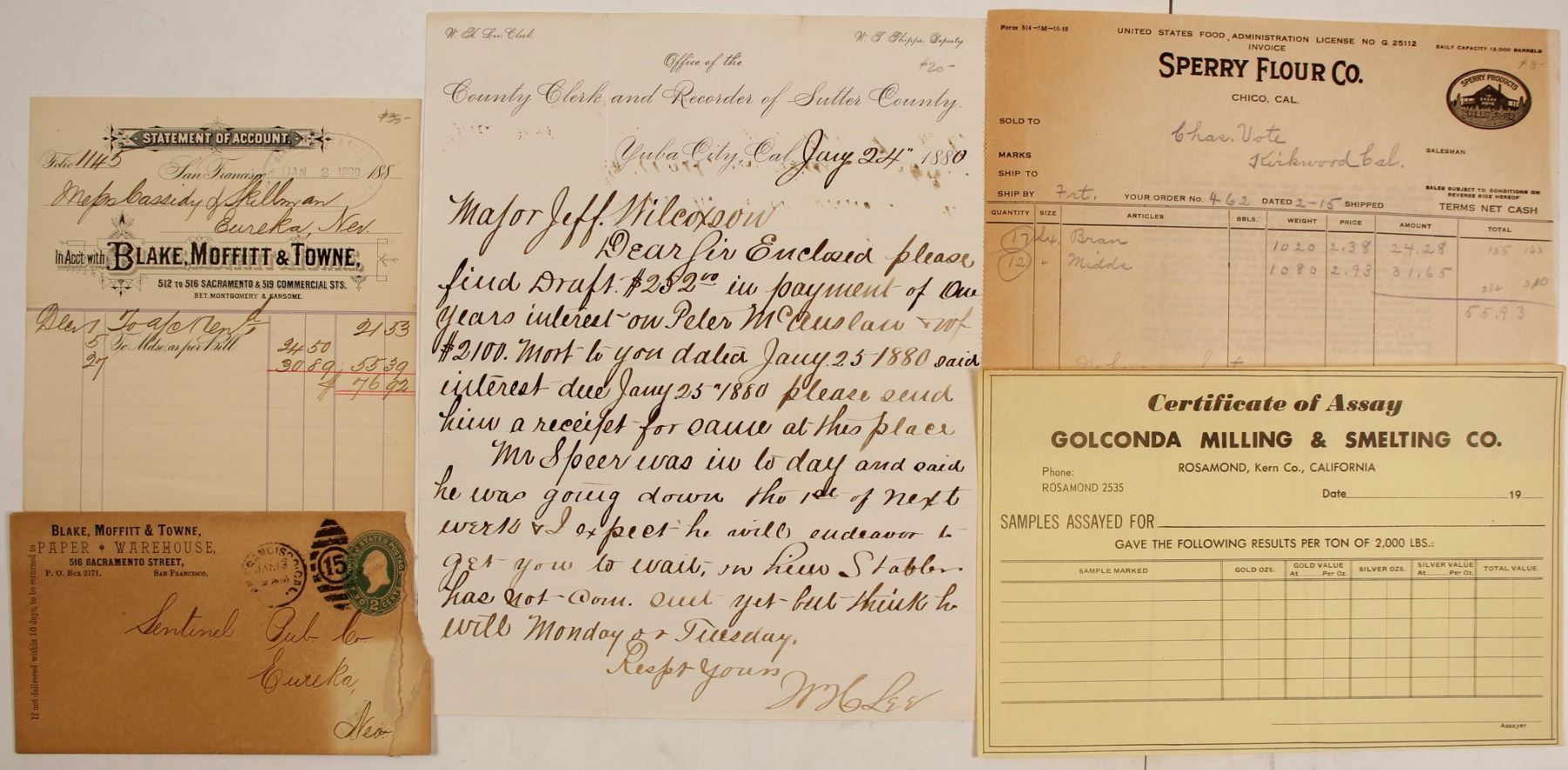 Lot of 6. Includes: AC Lowell, Fort Bidwell, Cal.,1894 billhead.; letterhead for the County Clerk and Recorder of Sutter County, Yuba City, Cal., 1880; Sperry Flour Co., Chico, Cal. billhead, 1915; cover and billhead for Blake, Moffitt & Towne, Paper Warehouse, San Francisco, 1889; and unused Assay Certificate for Golconda Milling & Smelting Co., Rosamond, CA.
