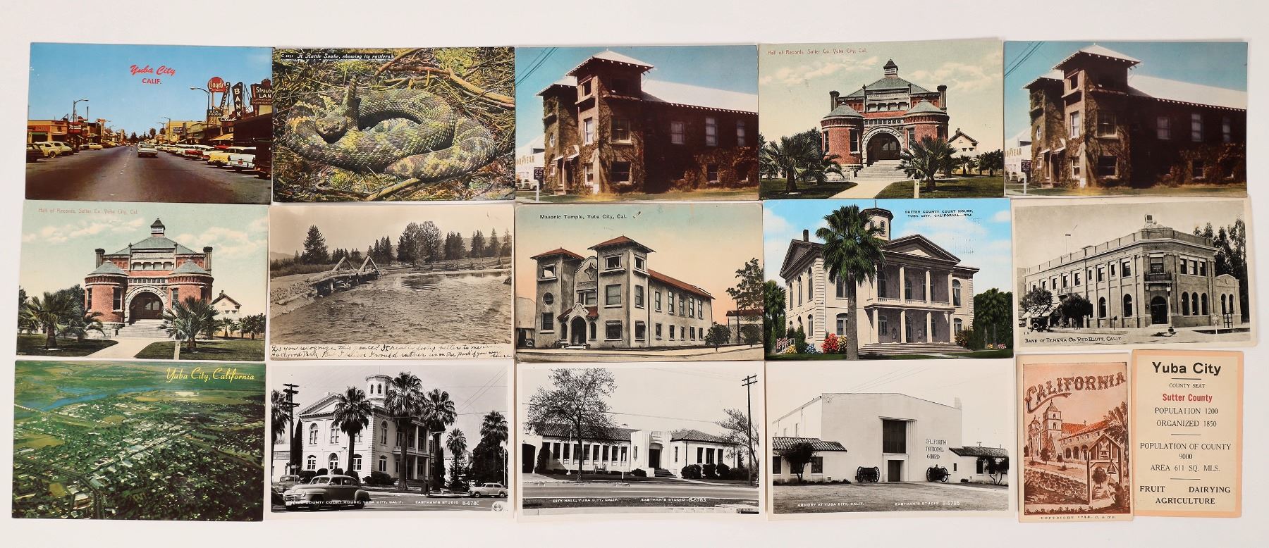 Lot of 15. Five RPC's. Two Calif. as info cards w/Mission on front backs?one is a map and the other are city stats. Postmarks: Yuba City, Marysville, (1979 10c stamps), Ashland & Gerber R.P.O. Ground level view : Masonic Temple, County Court House, National Guard armory, city hall,Hall of Records , street scene ('50's era). Birdseye of Yuba City 1979c. Yuba City 1909-79 Ken Prag Collection