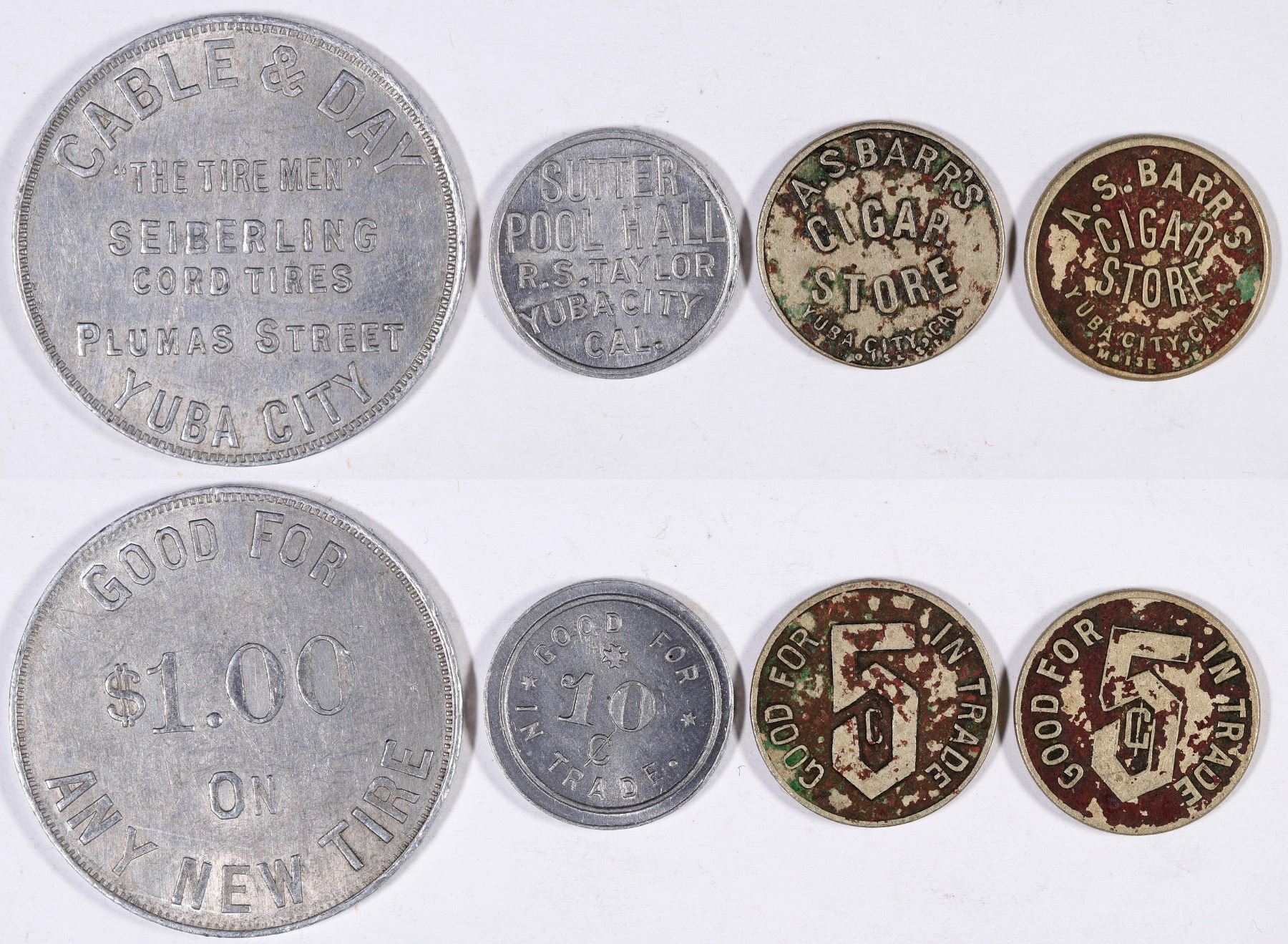 Lot of four tokens from the Sutter County town of Yuba City: 1 & 2) A.S. BARR'S / CIGAR / STORE / YUBA CITY, CAL. / MOISE KLINKNER CO. S.F. // GOOD FOR IN TRADE / 5¢; Wm, rd, 21 mm. 3) CABLE & DAY / "THE TIRE MEN" / SEIBERLING / CORD TIRES / PLUMAS STREET / YUBA CITY // GOOD FOR / $1.00 / ON / ANY NEW TIRE; Al. rd., 39 mm. 4) SUTTER / POOL HALL / R.S. TAYLOR / YUBA CITY / CAL. // GOOD FOR / 10 / ¢ / IN TRADE; Al., rd., 21 mm. Ex: Ron Lerch collection.