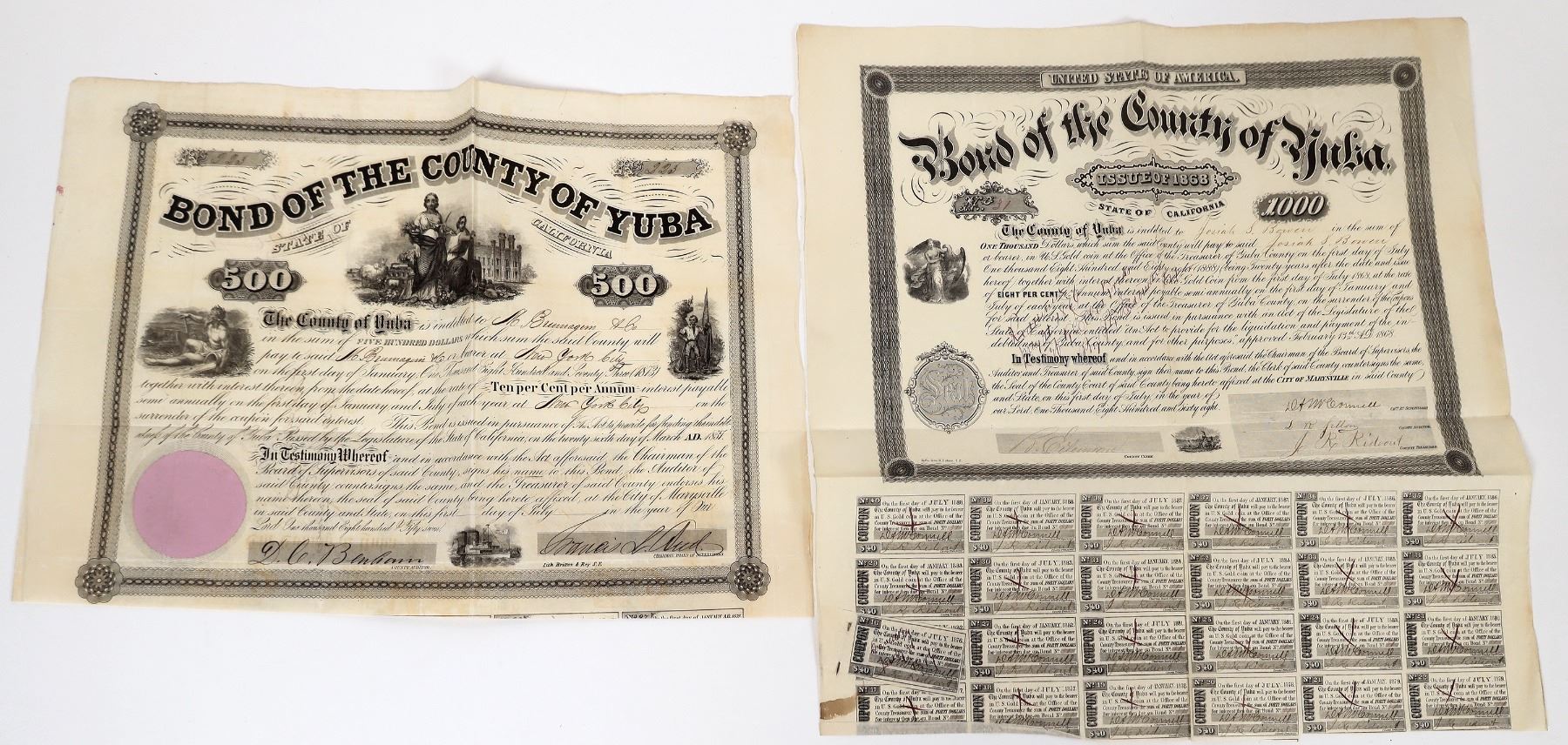 Lot of 2. 1) $500. No. 223, issued to M Bennagin & Co. on July 1st, 1857 in Marysville. Signed by the Chairman Board of Supervisors and County Auditor DC Benham. 15 coupons attached, pen cancelled. Black border and print, pink seal, and multiple allegorical vignettes. Lith. Britton & Rey. 15 x 16" Folds, creases. 2) $1,000. No. 31 issued to Josiah S. Bowen in Marysville on July 1st, 1868. Pen cancelled. Signed by the County Treasurer (JR Rideout), County Auditor (LR Jellon), and Chairman of the Board of Supervisors (McConnell). Black border and print, two small allegorical vignettes. Lith. Geo. H. Baker, SF. 25 coupons attached, pen cancelled. 16 x 16" Folds, creases.