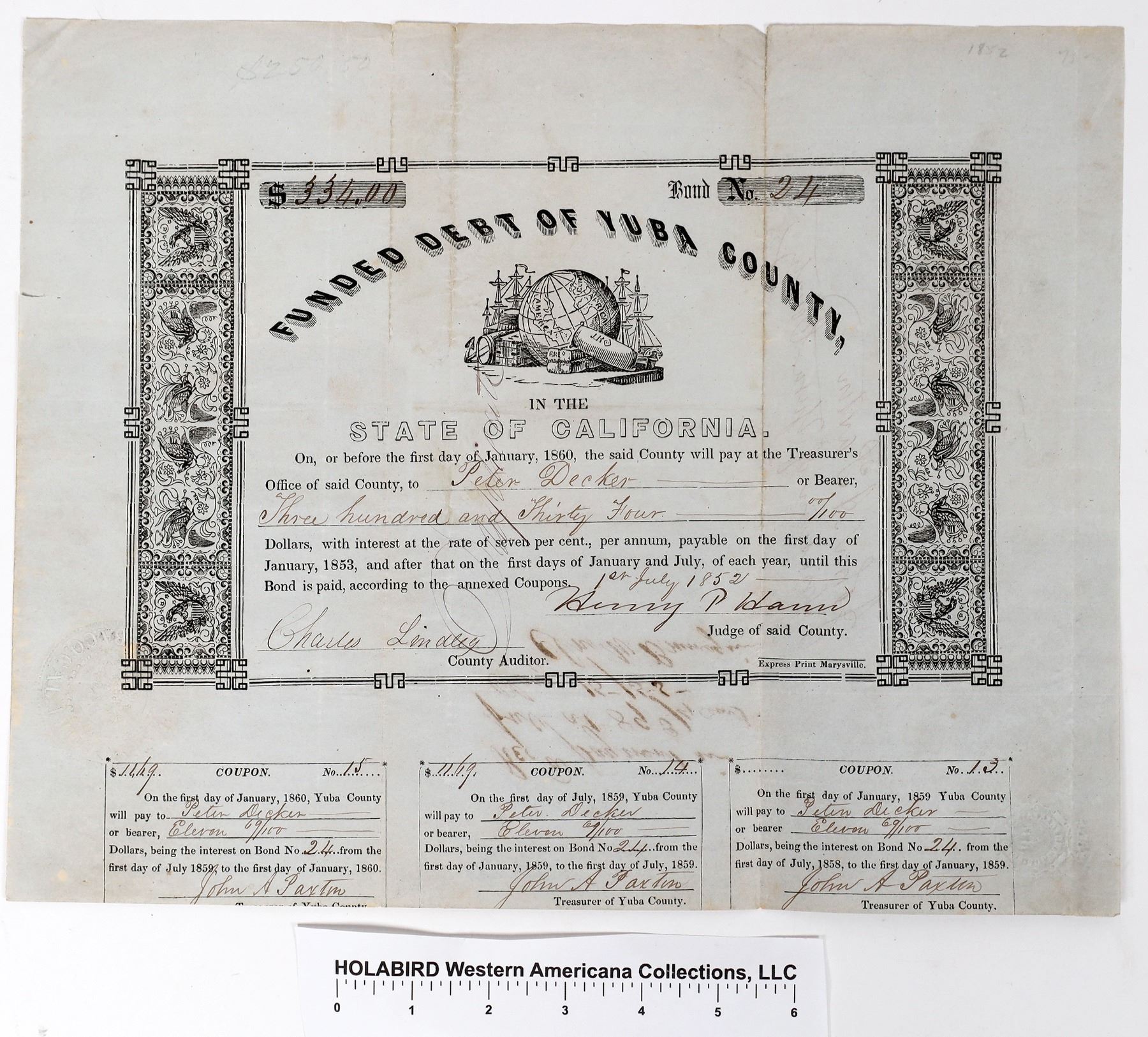 Funded Debt of Yuba County. No. 24, issued to Peter Decker on July 1st, 1852 for $334. Signed by Judge Henry P. Hann and county auditor Charles Lindley. Pen cancelled. To be paid in 1860. Black print on very thin blue paper. Vignette of globe and ships. Express Print Marysville. Ten coupons still attached. 12 x 10.5" Folds with some separation, toning. Yuba County was one of California's original counties, formed in 1850 at the time of statehood. Yuba County California 1852