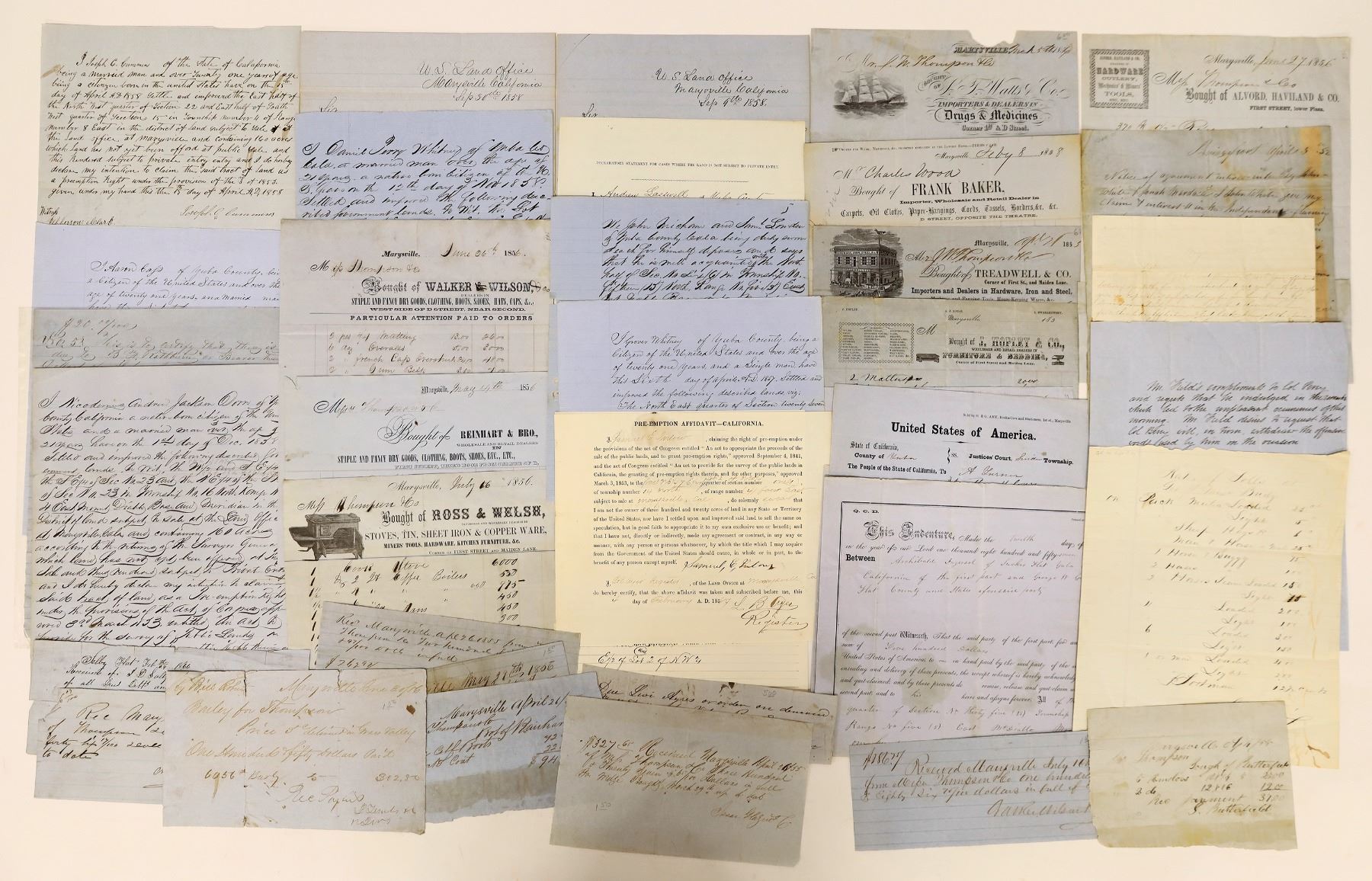 About 25 pieces of Yuba County Gold Rush ephemera, c. 1855-58, mostly on blue paper. Land transactions, quit claim, letterhead, mostly Marysville, billheads including pictorial, etc. Yuba County California