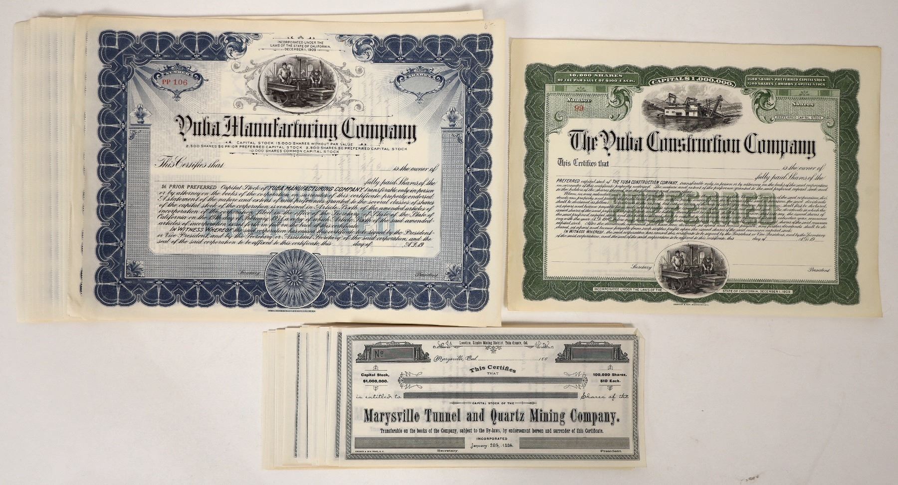 Unissued stock certificates, include 28 from The Marysville Tunnel and Quartz Mining Company, as well as 16 from The Yuba Construction Company. All are in nice condition. Please see photos for more detail.