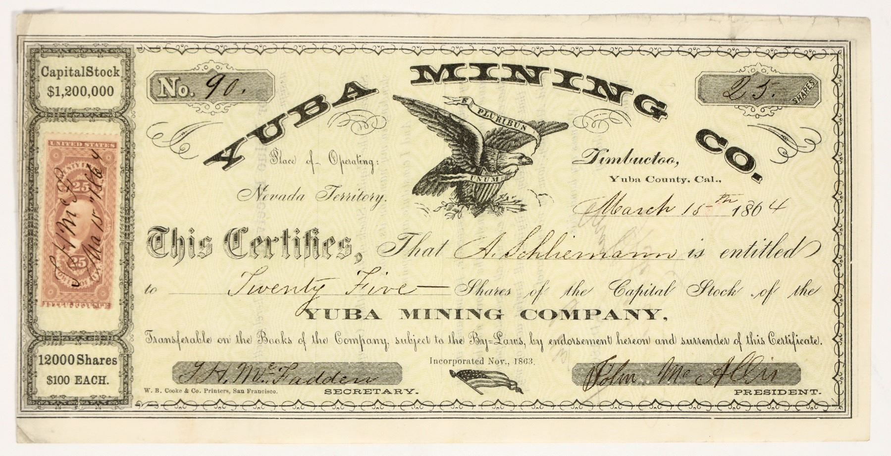"Place of Operating: Nevada Territory." Inc. Nov. 1863. Dateline Timbuctoo, Yuba County, Cal. No. 90, issued for 25 shares in March 1864. Signed by president John McAllis and secretary McFadden. Not cancelled. Black border, green background, and eagle vignette. 25 cent adhesive revenue stamp, pen cancelled. Printed by WB Cooke & Co. 5 x 9.5" This has long been presented as a Timbuctoo mining company, though newspaper research explains why the stock says "Nevada Territory." While the company's office was in Timbuctoo, the mining property was in the Washington District of Lander County, Nevada Territory! Timbuctoo is an unusual place to have a mining office. Thriving during the era of hydraulic mining, this Sierra Nevada town of 1,200 pioneers contained a church, a theater, stores, hotels, saloons, a Wells Fargo office, and the Stewart Brothers store. The town of Timbuctoo got its name from a nearby ravine that was used for hydraulic mining as early as 1850; the ravine was named Timbuctoo after an African American who was one of the first miners of the area. Extensive hydraulic mining tailings remain throughout the region as evidence of its lively pioneer past. According to Tingley, the Washington District of Lander County was located on the western slope of the Toiyabe Range about 25 miles south of Austin. It was also known as the San Juan Canyon District.