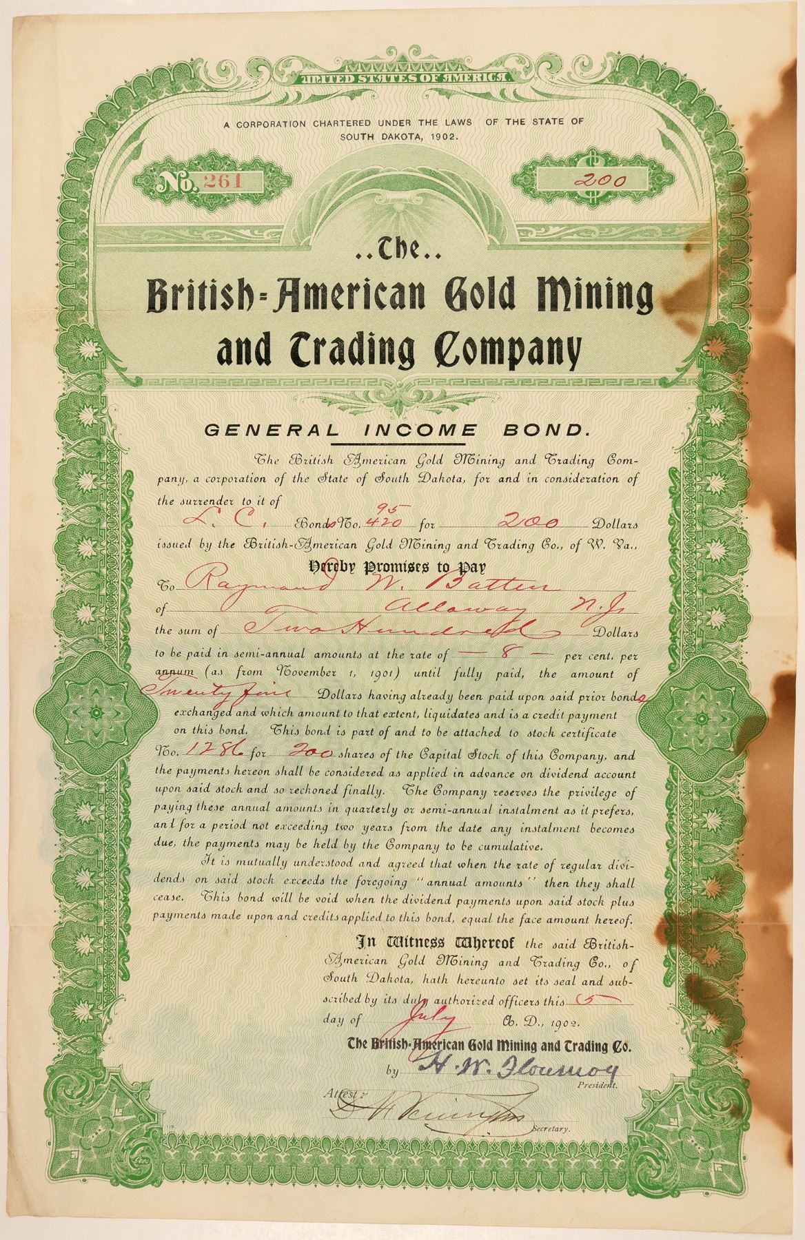The United States Investor, in responding to an inquiry, on what was surely this company, said it was held by someone who had already been suspected of fraud for promoting a large tract of British Columbia during the Klondike rush. They did not hold much hope for this company as they could find "no authentic information' on this company. 1902 general income bond attached to stock certificate 1286 for 200 shares. Heavy discoloration on right. 15 x 10". Ken Prag Collection